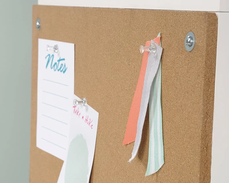 - • Swivel base with storage on all sides • Includes pegboard back and corkboard panel • Two storage drawers