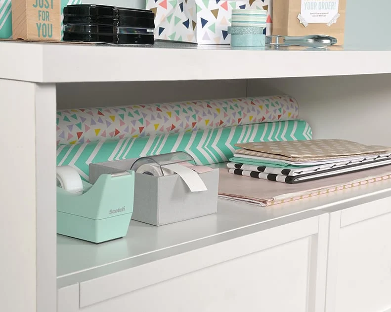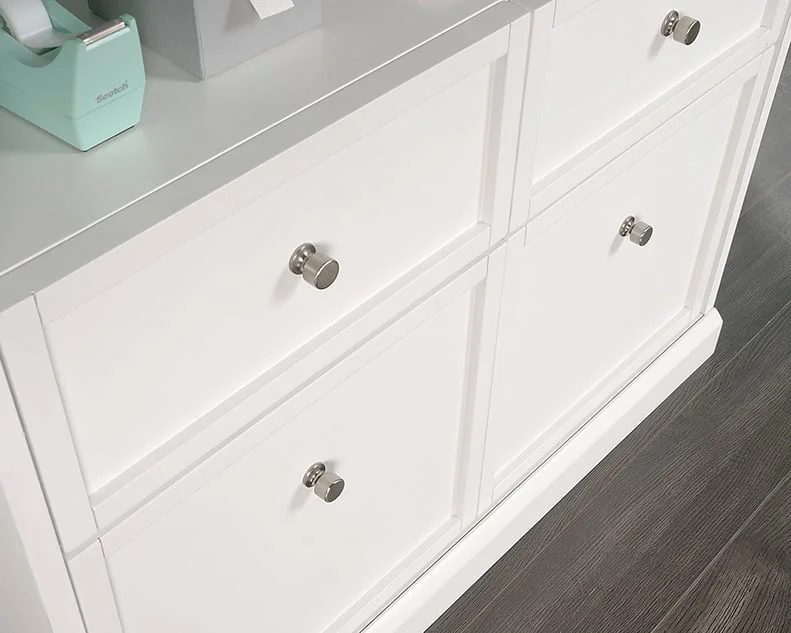 moreScrapbook paper, scissors, and stamps – store it all in this storage cabinet from the Craft Pro Series® collection. This craft cabinet features four easy gliding drawers with full extension slides for storage of yarn, construction paper, and other crafting tools. An open shelf allows for easy access storage of all your crafting materials. This craft storage cabinet also includes a melamine top surface that is resistant to heat, stains, and scratches, so you can craft without any worry. Use the top surface of this storage cabinet for crafting for your latest project, home décor, or photos of your family. Finished in White, this sleek 4-drawer storage cabinet is the perfect solution to all your storage needs. We hope you like what you see. Sauder designers travel the world and bring back the best and latest in style, finish, and color trends. This inspiring world travel is evident in the cutting edge and innovative furniture solutions we offer to you!