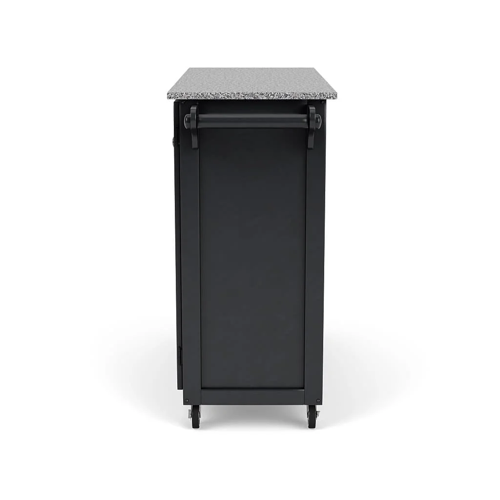 moreCreate a stylish statement with this kitchen cart. This versatile kitchen cart features a handsome black finish and a salt-and-pepper granite surface, which is ideal for preparing and serving meals. Great for a craft room too. Constructed of premium-level, solid wood. This cart offers plenty of storage with four large, easy glide drawers and two cabinet doors with customizable shelves inside and stylish recessed panels. The cart has a towel bar on each side and a spice rack. Locking rubber casters allow portability, with two locking for stability. Comes carefully packaged with all items labeled and coordinating easy-to-follow assembly directions.