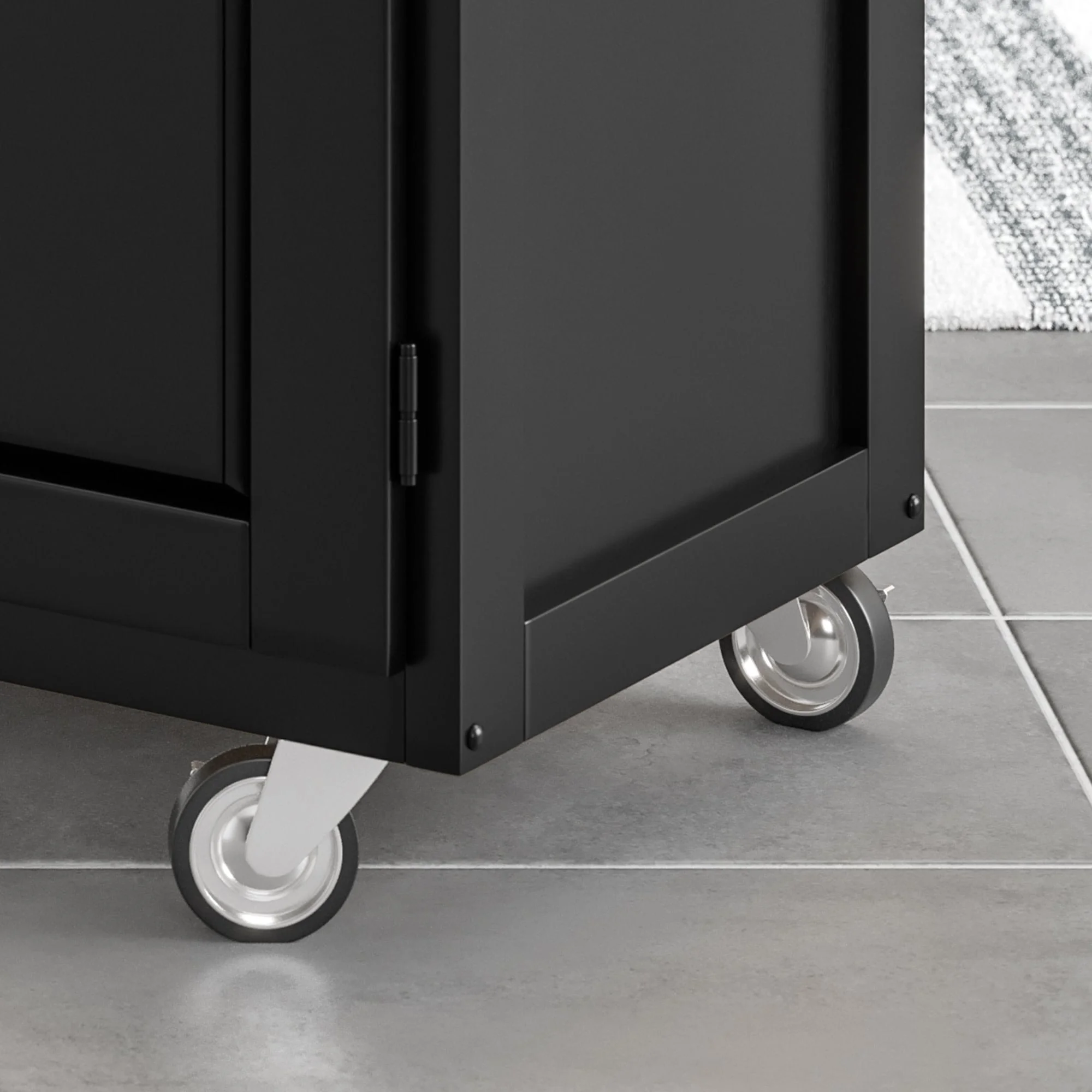 Industrial-strength casters to make it easier to move heavy loads while protecting your floor surface., Ageless salt and pepper granite top is both beautiful and durable, providing resistance to heat, scratches and stains., Black finish for a chic look that never goes out of style., Constructed of rubberwood, an extremely durable hardwood.