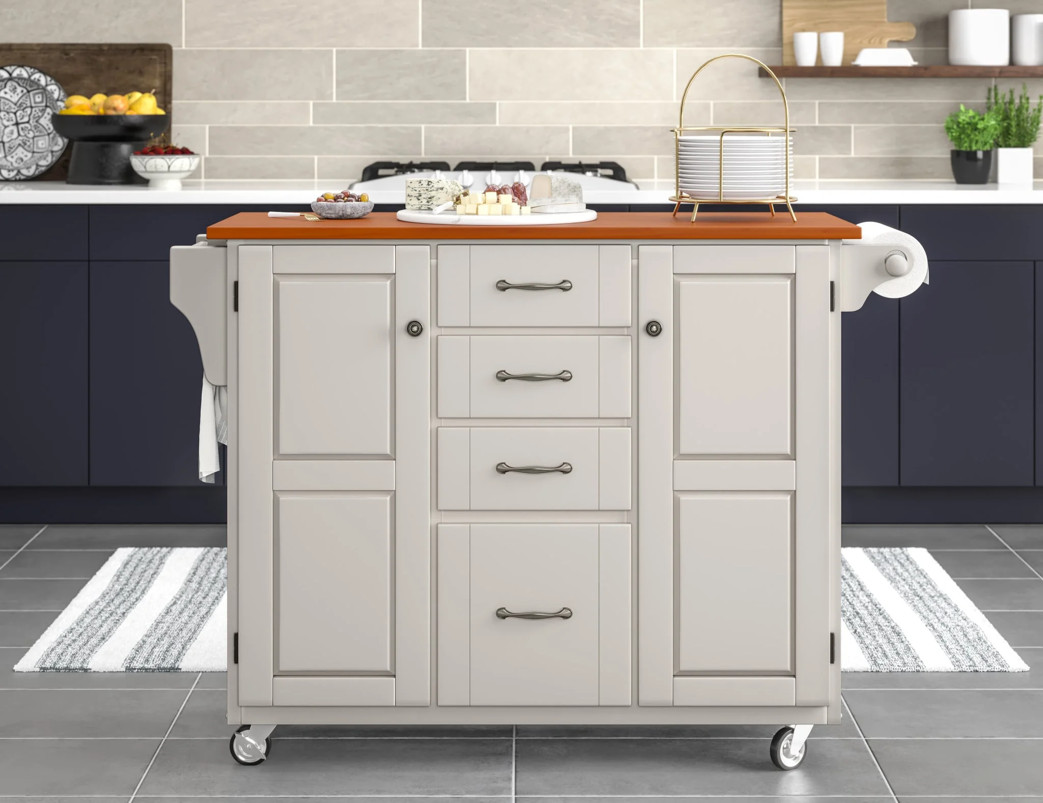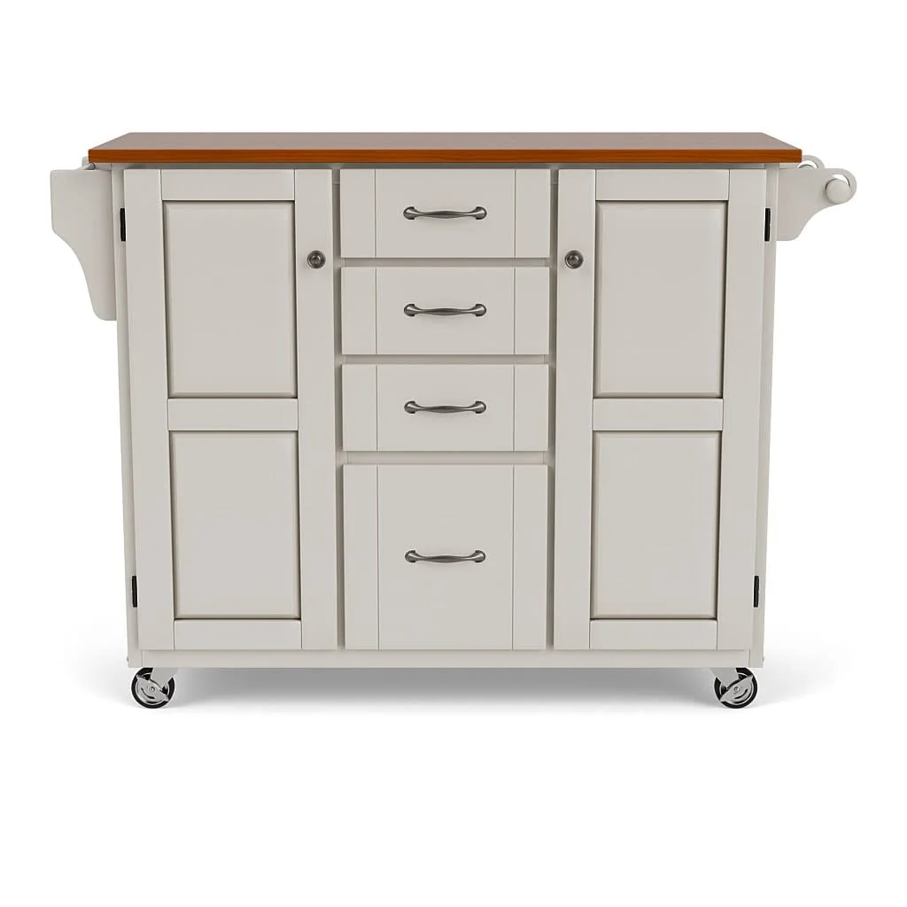 moreCreate a stylish statement with this kitchen cart. This versatile kitchen cart features a handsome off-white finish and a .75" oak-finished wood surface with a protective coating, which is ideal for preparing and serving meals. Great for a craft room too. Constructed of premium-level, solid wood. This cart offers plenty of storage with four large, easy glide drawers and two cabinet doors with customizable shelves inside and stylish recessed panels. The cart has a towel bar on each side and a spice rack. Locking rubber casters allow portability, with two locking for stability. Comes carefully packaged with all items labeled and coordinating easy-to-follow assembly directions.