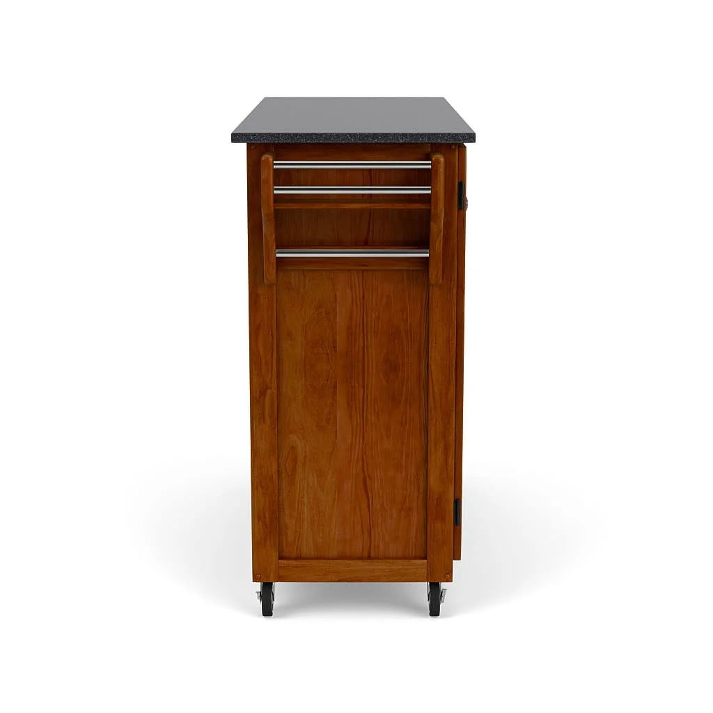 Locking rubber casters allow portability, with two locking for stability, Cherry finish and black granite surface, Towel bar on each side and a spice rack, Constructed of premium-level, solid wood