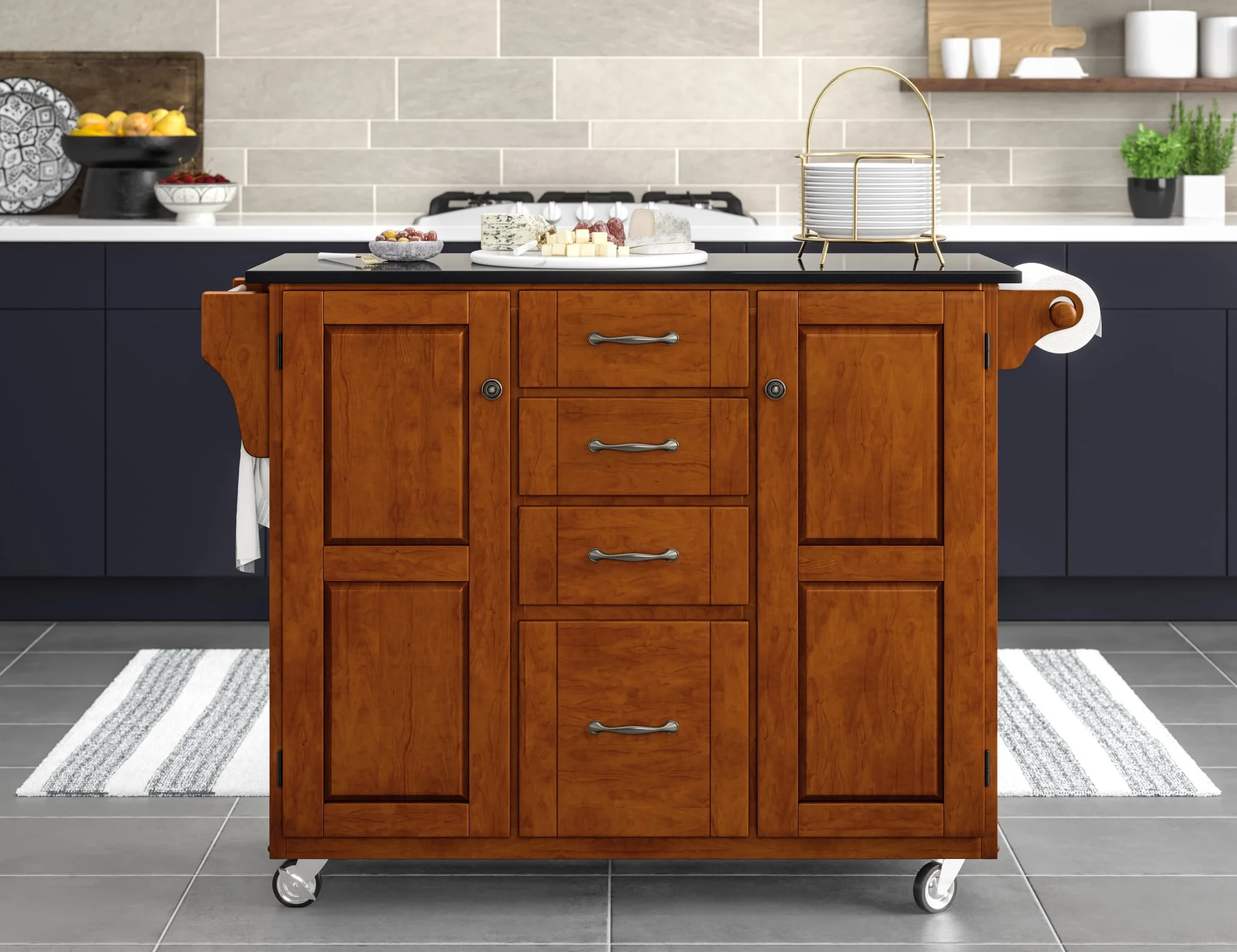 moreCreate a stylish statement with this kitchen cart. This versatile kitchen cart features a handsome cherry finish and a black granite surface, which is ideal for preparing and serving meals. Great for a craft room too. Constructed of premium-level, solid wood. This cart offers plenty of storage with four large, easy glide drawers and two cabinet doors with customizable shelves inside and stylish recessed panels. The cart has a towel bar on each side and a spice rack. Locking rubber casters allow portability, with two locking for stability. Comes carefully packaged with all items labeled and coordinating easy-to-follow assembly directions.