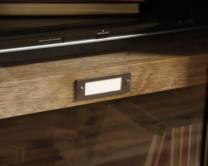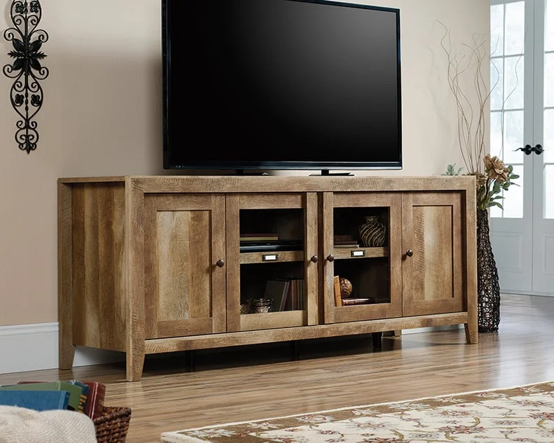 moreAccommodates up to a 70" TV weighing 95 lbs. or less. Adjustable shelf behind each door. Center doors feature safety-tempered glass. Accommodates ID label tags. Quick and easy assembly with patented slide-on moldings. Enclosed back with cord access. Craftsman Oak® finish.