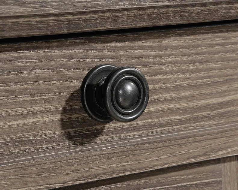 moreDurable, 1" thick top. Slide-out keyboard/mouse shelf with metal runners and safety stops. Three drawers with full extension slides; lower drawer holds letter or legal size hanging files to keep you organized. Storage area behind door features an adjustable shelf and holds a vertical CPU tower. Finished on all sides for versatile placement anywhere in your home. Cord management includes desktop grommet to keep your cord clutter neatly contained. Detailing includes solid wood feet. Emery Oak® finish.
