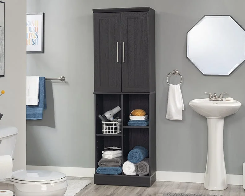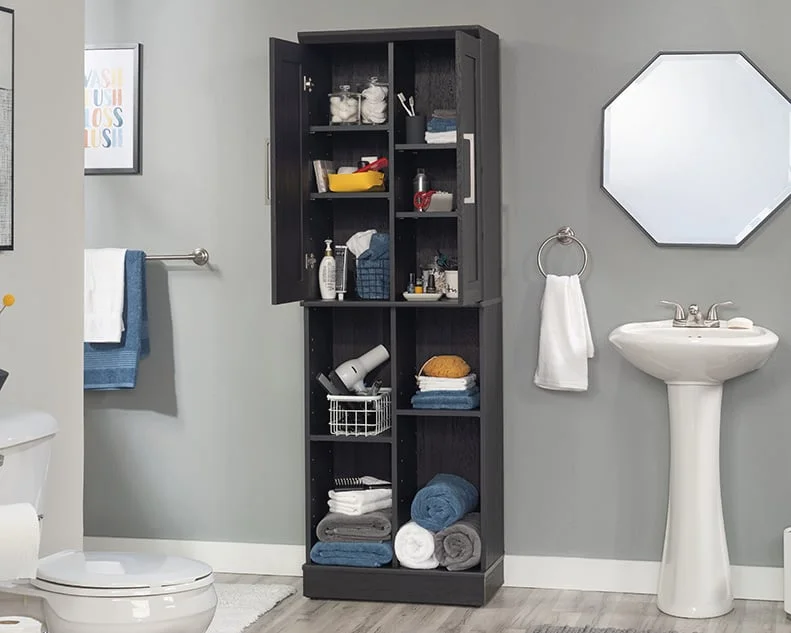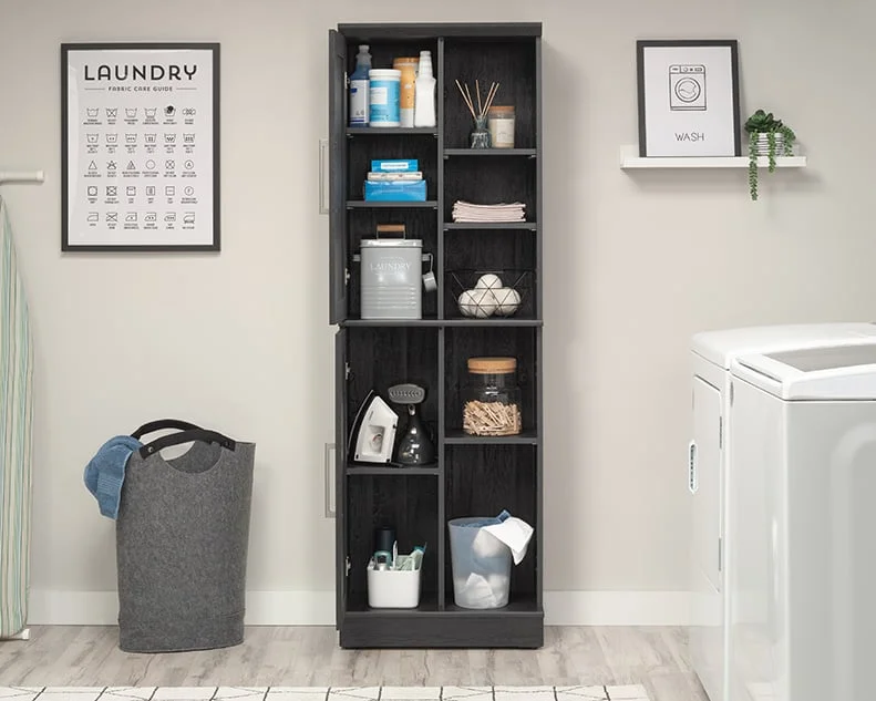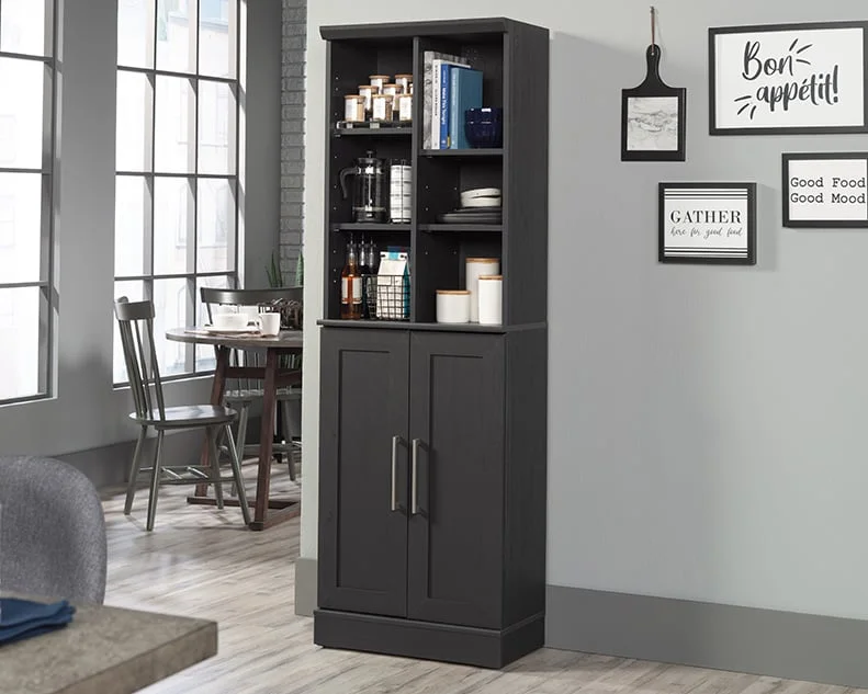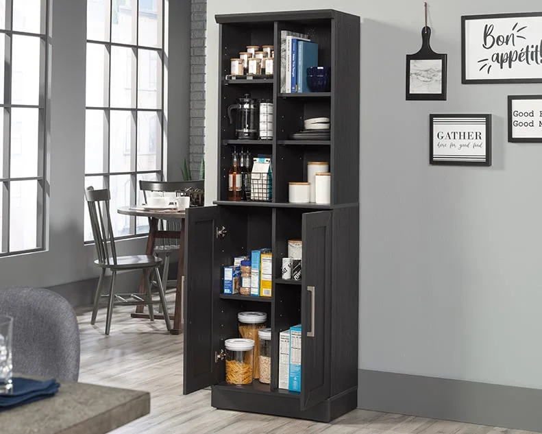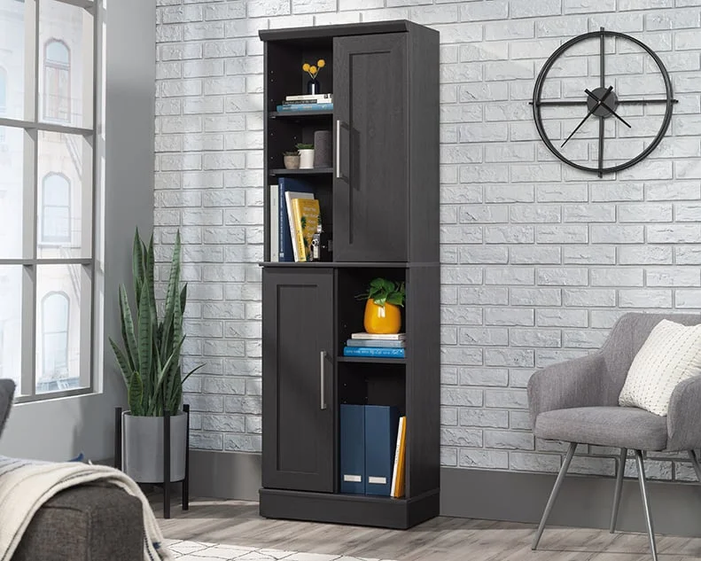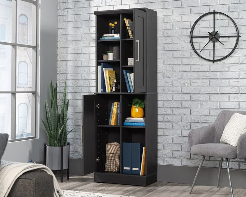 moreCraft supplies have met their match; pantry items and bed linens prepare to be organized; introducing the modern storage cabinet from the HomePlus Collection. This multipurpose 2-door storage cabinet has an easily configurable design which allows its doors to be positioned on the top, bottom, left or right. With six adjustable shelves, this double door storage cabinet will provide the ultimate versatility for storage of all items, big or small; whether it’s tall vases of flowers, bins of toiletries, or baskets of snacks. Perfect for a laundry room organizer or a kitchen pantry extension, this storage cabinet with doors has pulled out all the stops. The enclosed back panel of this engineered wood storage cabinet provides cord access for easy and convenient cable management for electronic devices and adjustable base levelers give an added stability. Finished in the dark and stately Raven Oak®, this storage cabinet will take your clutter to classy in no time at all.