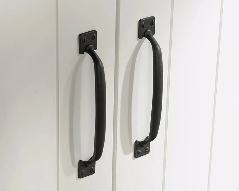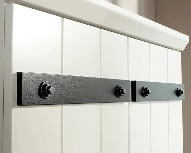 moreFour adjustable shelves for customizable storage options. Details include planked barn door styling. Enclosed back panel has cord access for reduced cord clutter. Adjustable levelers at the base provide stability over uneven surfaces. Soft White® finish