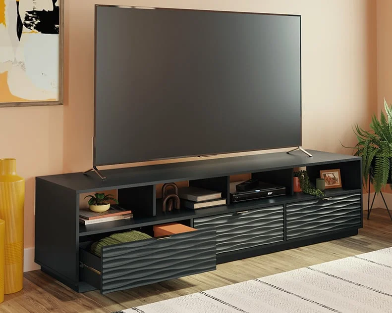 moreAccommodates up to an 85" TV weighing 135 lbs. or less. Three drawers feature metal runners and safety stops for remotes, games, and more. Drawer fronts feature decorative wave pattern. Divided shelving holds audio/video equipment. Finished on all sides for versatile placement in any room of your home. Black finish.