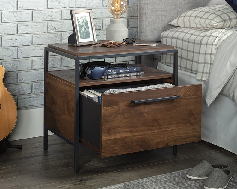 Drawer with metal runners and safety stops holds books, reading glasses and more. Open shelf provides additional storage for the TV remote, smartphone and other bedside necessities. Finished on all sides for versatile placement anywhere in your home. Powder coated metal frame for durability and design. Grand Walnut® finish.