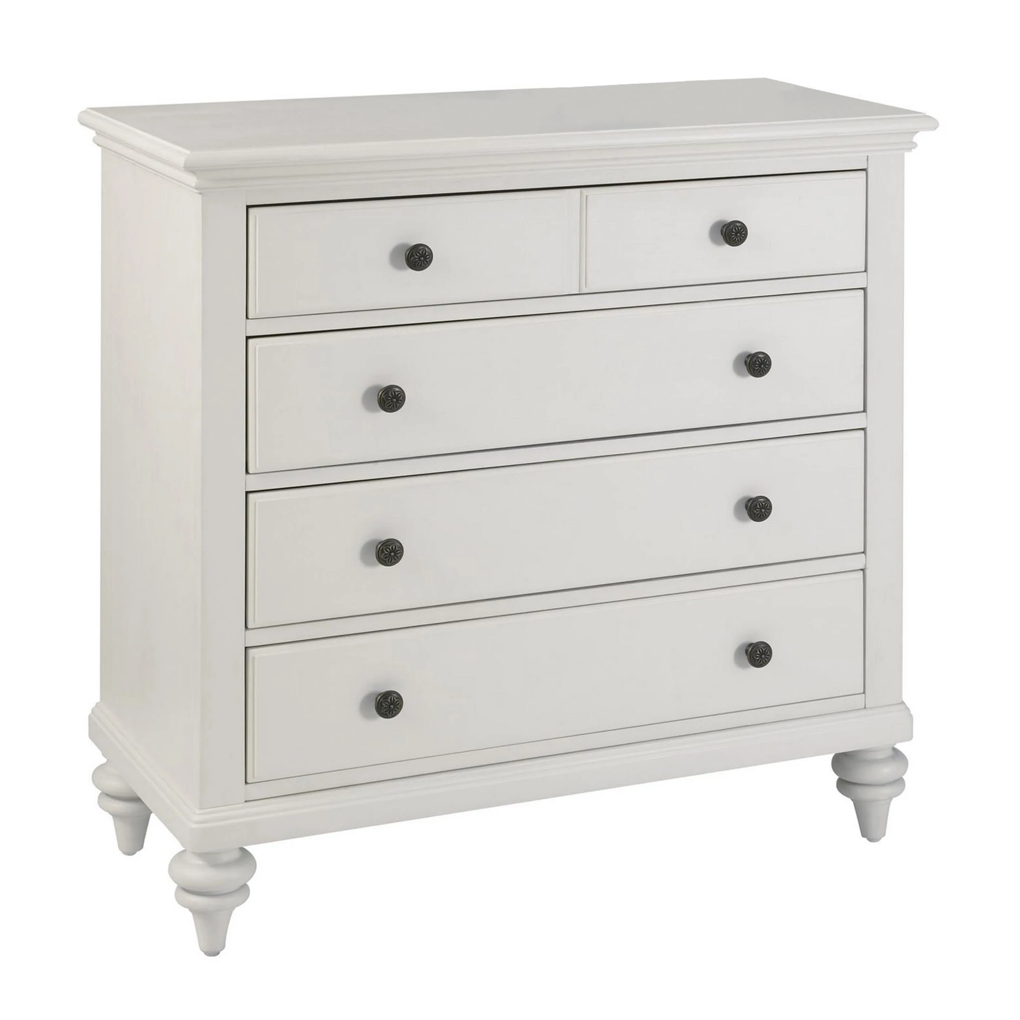 moreInspired by the fusion of British traditional and old world tropical design, this bedroom chest highlights solid mahogany and engineered woods in a brushed white finish. Deep textured brushed stroke finish enhances the overall beauty of this luster white finish. Further inspiration can be found in the shutter style design, turned feet and antique brushed nickel hardware. The chest features four storage drawers with the top storage drawer lined in black felt.