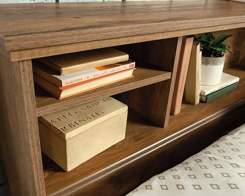 moreAdd storage and display space and make a statement with this full/queen headboard from the River Ranch® collection. This queen bookcase headboard attaches to a full or queen size bed frame, allowing you to upgrade any room—the master bedroom, a guest room, or the mother-in-law suite. Use the abundance of display area for your alarm clock, glass of water, jewelry and more. Two adjustable shelves allow you to customize and style your new full-size bookcase headboard to your specific needs. It is easy to charge your phone while you’re sleeping because this queen headboard with storage accommodates optional Hidden Wireless Qi Compatible Charger by Eggtronics 425905 (sold separately – visit sauder.com for more information). Your full-size headboard with storage will remain free of tangled cords thanks to the enclosed back panel that allows for a convenient pathway for your phone or smart watch charger. Finished in Sindoori Mango®, this full/queen headboard brings functionality to your home and looks good doing it.