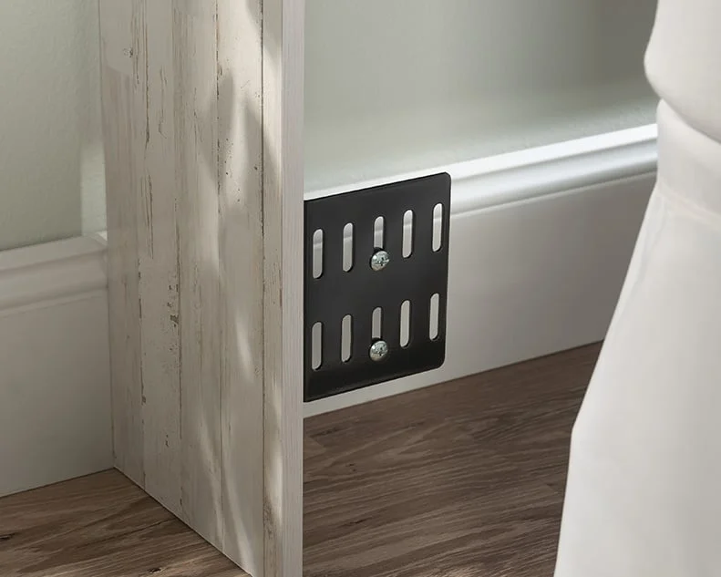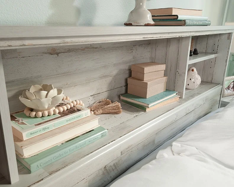 moreA headboard that works as hard as you do. This full/queen headboard from the River Ranch® collection blends in with your modern farmhouse décor while making a big statement in your bedroom. This queen bookcase headboard attaches to a full or queen size bed frame, making it the perfect choice for the master bedroom, the guest room, or just about anywhere you need a bed solution. This headboard features a spacious display area for your alarm clock, phone, tablet, or books—all your bedroom essentials. This rustic bookcase headboard features two adjustable shelves to customize the storage and display space to your liking and needs. Charge your phone in a snap, because this queen headboard with storage accommodates optional Hidden Wireless Qi Compatible Charger by Eggtronics 425905 (sold separately – visit sauder.com for more information). Your full-size headboard with storage will remain free of cord clutter with the enclosed back panel that features cord access to charge your phone or smart watch. Finished in a rustic White Plank®, this full/queen headboard upgrades any room with style and function.