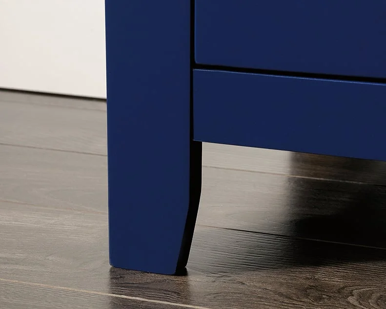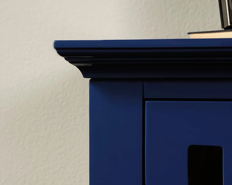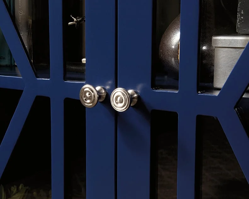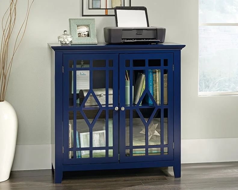 moreCraving some unique style for your home? You are in luck! This display cabinet from the Shoal Creek® collection offers elegant design and functionality to make this the perfect statement piece for your home. Its framed, safety-tempered glass doors feature a geometric, cut out design that gives this piece its one-of-a-kind look that is sure to catch the attention of all your guests. Behind its double doors is a storage area that includes a large shelf that is perfect for storing and displaying anything from your abundance of cook books and organizing bins to prized possessions and decorative knick-knacks. Its spacious top surface also makes an ideal spot for an accent lamp, plants, and photos of the family. This versatile cabinet adds charm and functionality no matter where it stands – in the entryway, down the hallway, or as an accent piece in the living room. Finished in Indigo Blue, this beautiful cabinet will give your home a fresh new look.