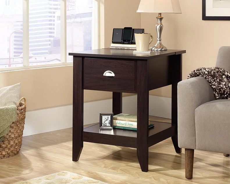 The Shoal Creek Transitional One-Drawer Side Table with Lower Shelf Storage, made by Sauder,