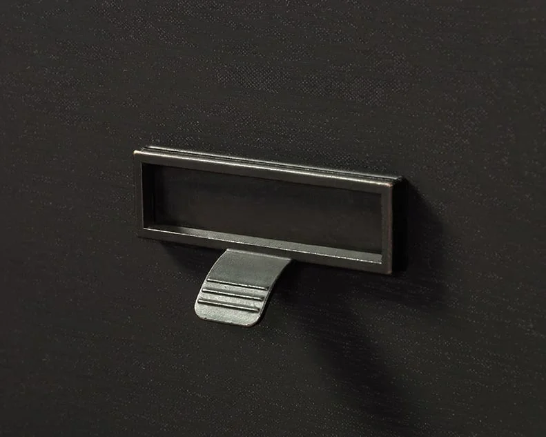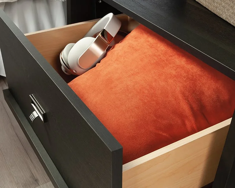 Drawer with metal runners and safety stops features T-lock assembly system. Accommodates ID label tags. Open shelf provides additional storage for books, glasses, and more. Finished on all sides for versatile placement with a polished look. Raven Oak® finish.
