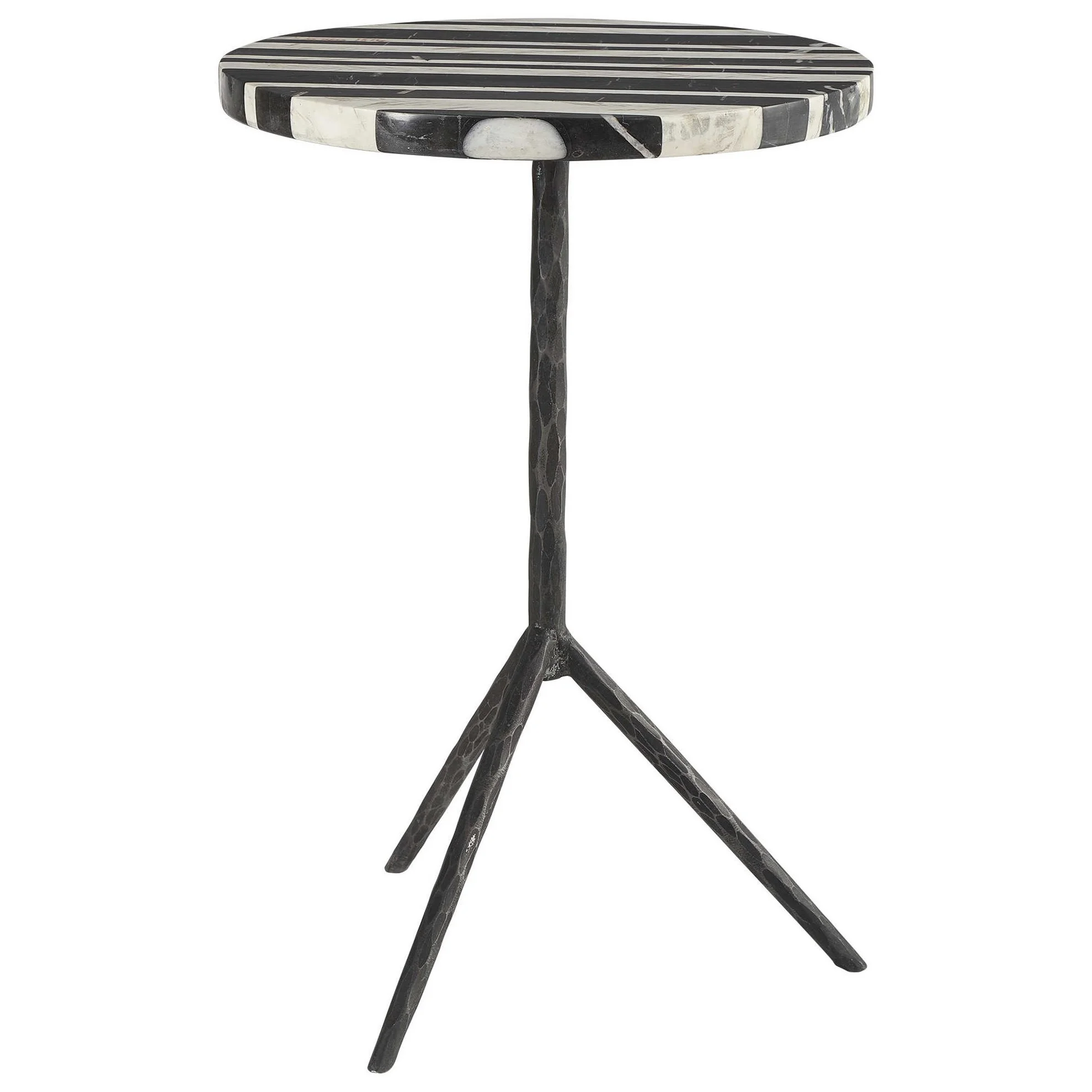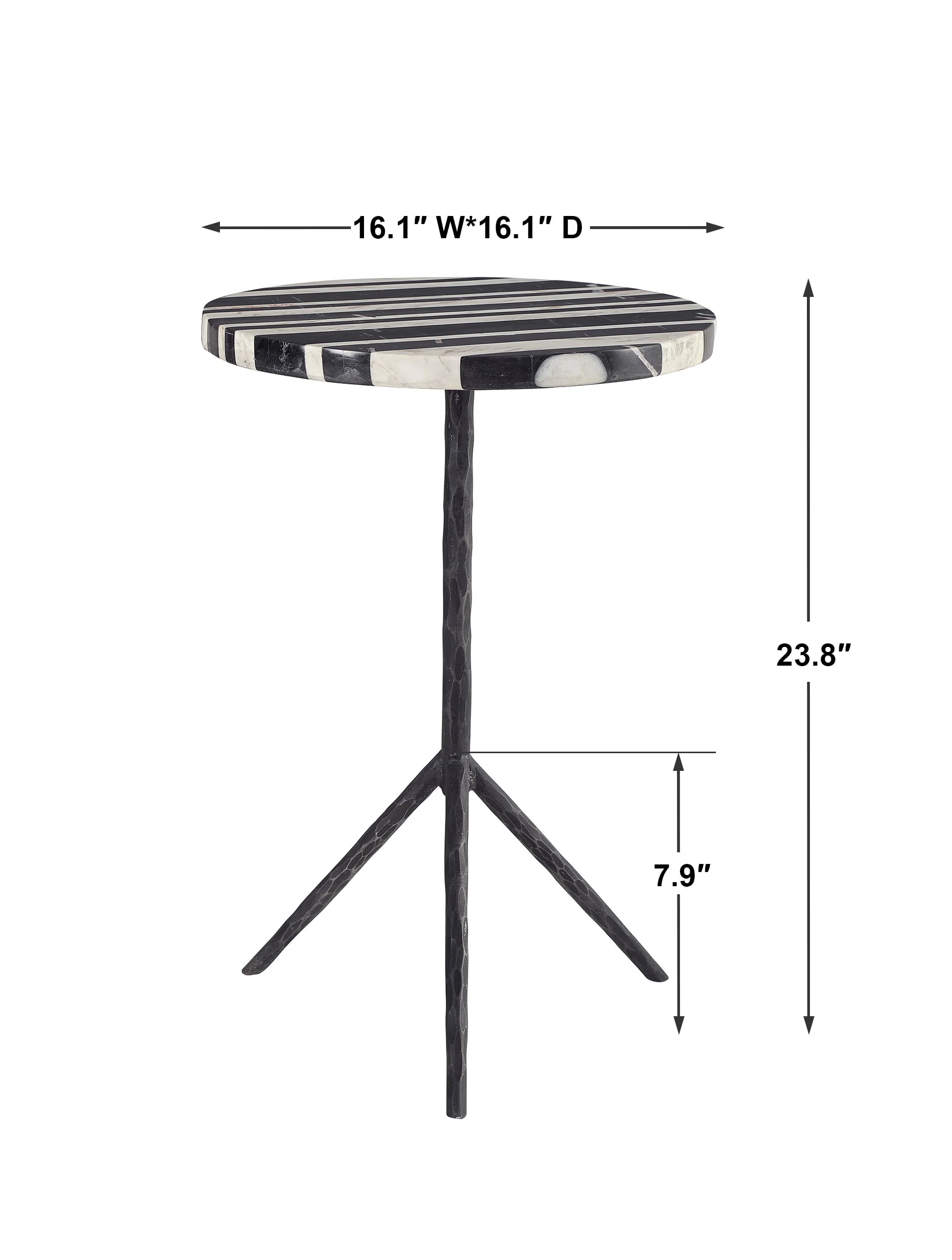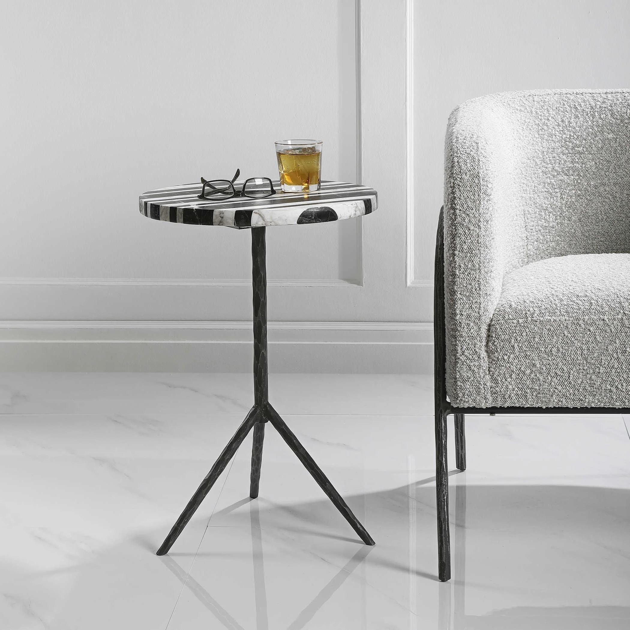 - A Unique Blend Of Classic And Modern Details, This Round Accent Table Showcases An Asymmetrically Striped Black And White Marble Top Over A Chiseled Iron Tripod Base In A Naturally Distressed Aged Iron Finish. True To The Nature Of Natural Materials, Each Piece Will Have Unique Marbling And Veining Throughout.
