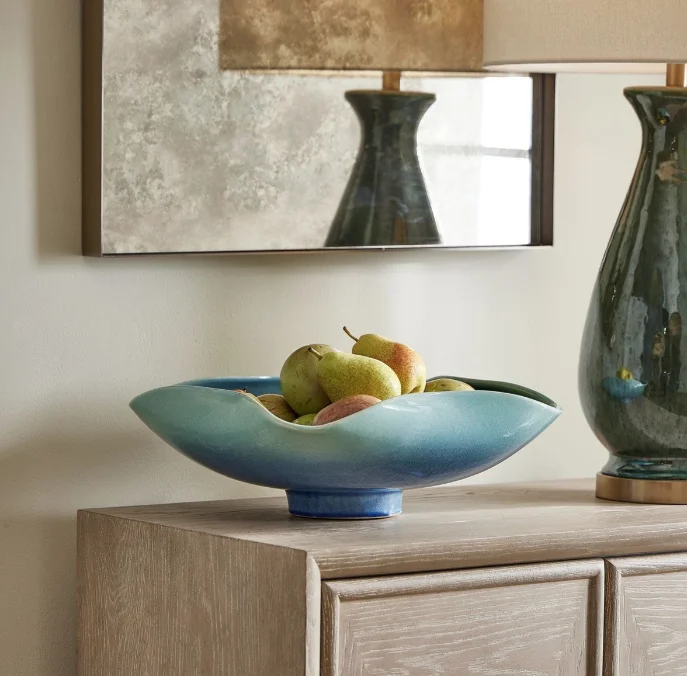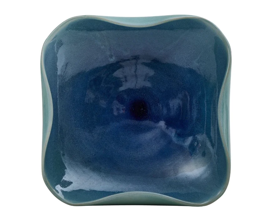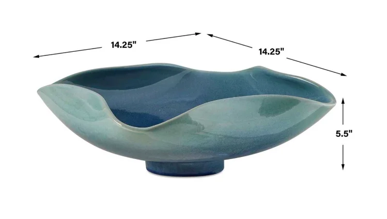 moreElevate your decor with this stunning, handcrafted ceramic bowl featuring a mesmerizing blue-green glaze. Its organic, wavy edges and glossy finish create a striking visual appeal, a true blend of artistry and functionality. May be hung on wall or used as tabletop accessory. Safe for outdoor use, but protection from freezing temperatures is recommended.