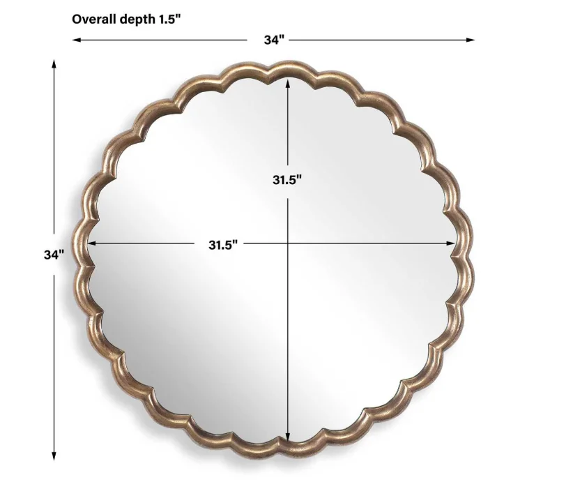 moreThe Cerrito Round Mirror showcases a thick cast aluminum frame with a gracefully curved scalloped design and subtle pitted texture finished in a plated antique brass.