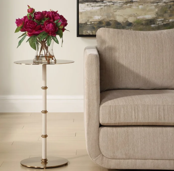 moreThis accent table showcases a white faux shagreen leather wrapped body, offering a soft, textured appeal with brass plated steel bands that rise along the body. The table top is crafted from brass plated steel, adding a touch of modern luxury to the piece.