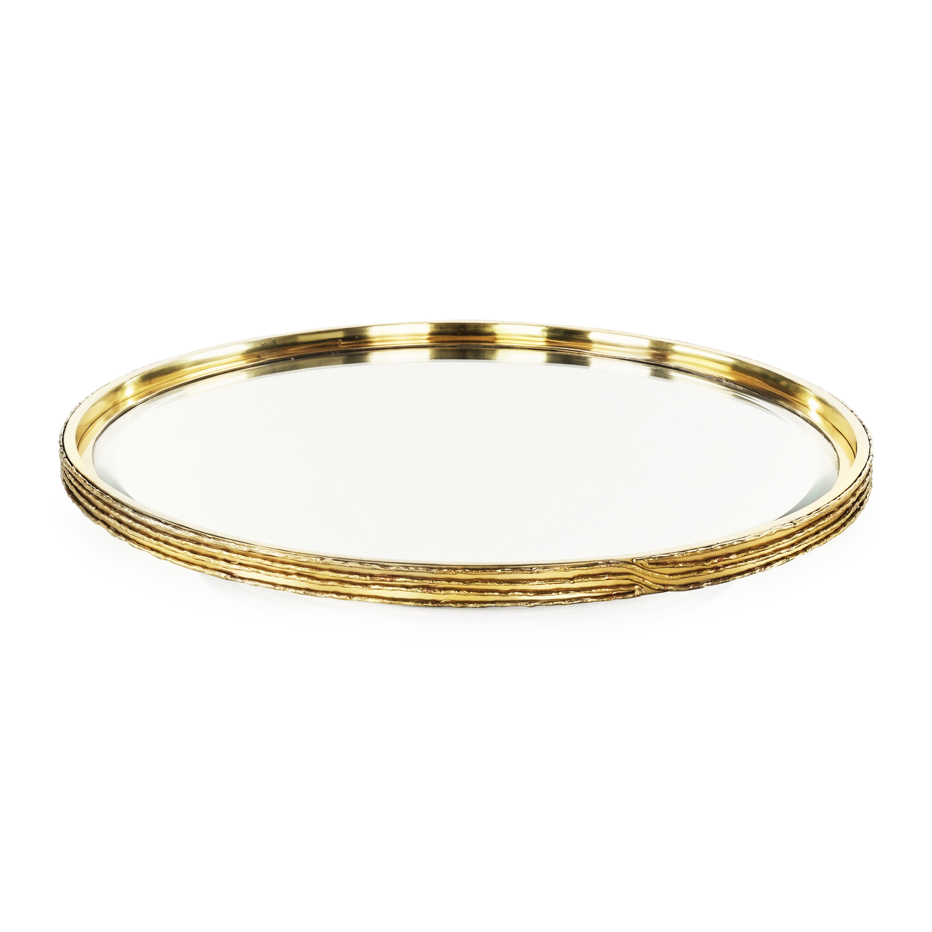 moreThe Ringed Tray is the perfect accent for introducing a healthy dose of texture to your décor. This round brass tray features an alluring ringed pattern along the sides, complemented by an interior surface of glass.