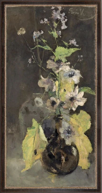moreA vase of flowers in shimmering gold and green tones and soft blush against a smoky dark earth ground. The rough brush stokes are simple, luscious and confident. Framed in a thin dark wood moulding with a beaded detail.
