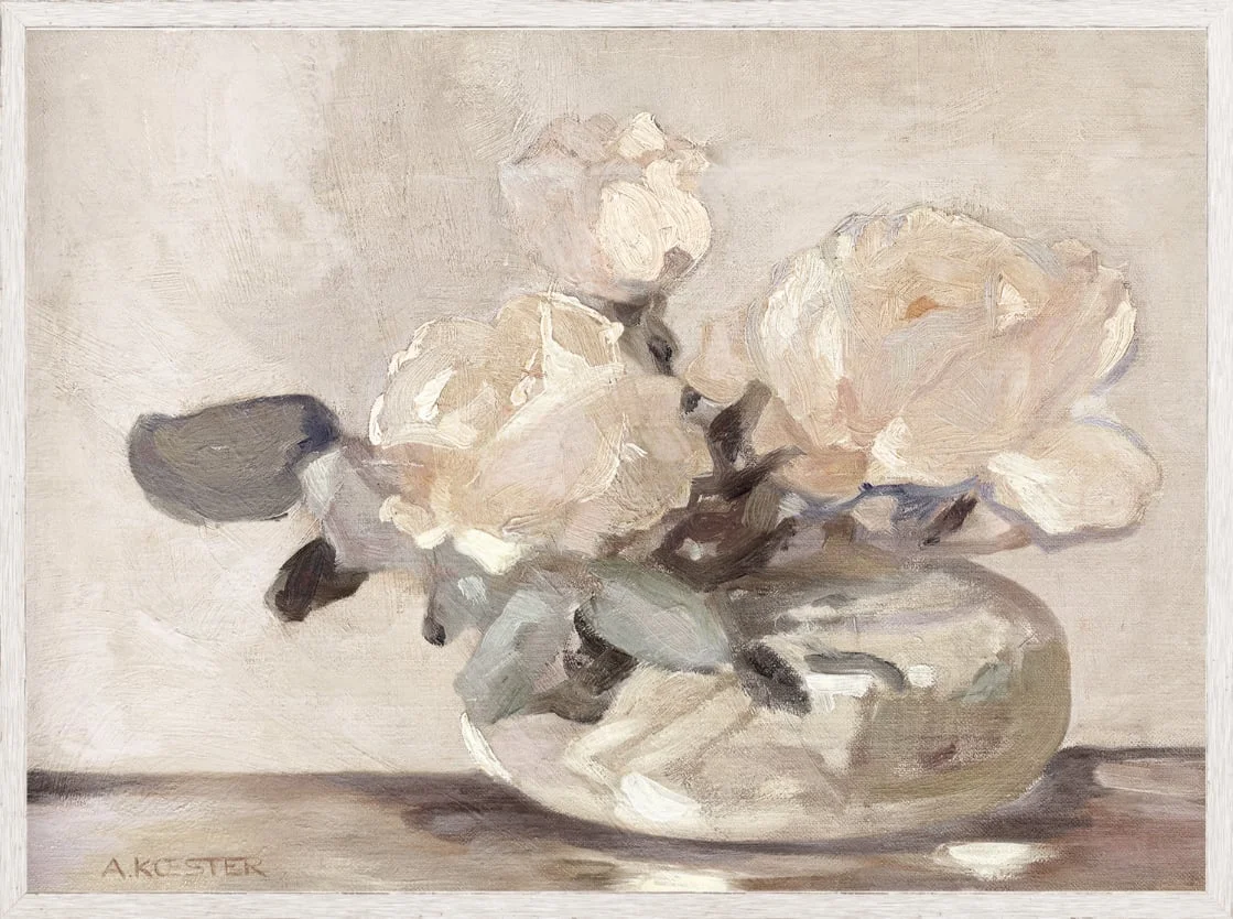 moreThis floral still life from the 20th century depicts beautiful, warm rose blooms in a round vase. The loose rendering of the piece suggests the shapes and forms of the petals while maintaining a soft, dreamlike quality.