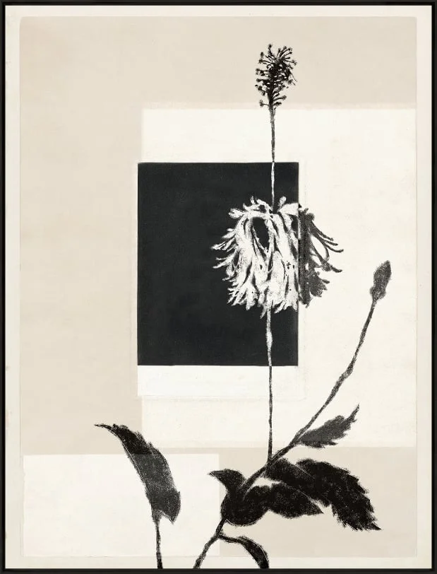 moreGraphic florals drawn on an aged paper background with light and dark rectangles that amplify their composition.