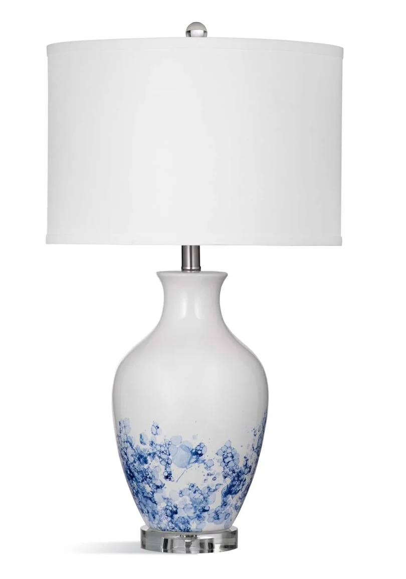 moreThe Sirius Table Lamp is crafted of ceramic in a white and blue finish in a bubble reactive glaze with a white linen drum shade and silver accents. The hand crafted details are produced by a skilled artist, lending itself to a unique technique and which may feature slight variations between each piece. The white linen lamp shade measures 15x15x10.