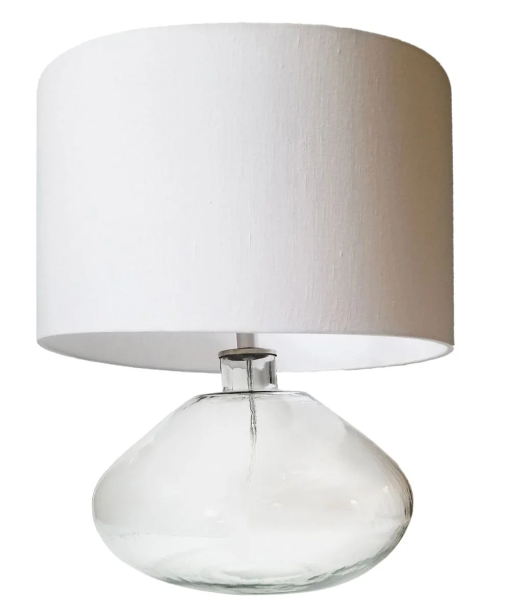 moreA modern take on a classic design, this shapely table lamp pairs easily with both minimalist and maximalist décor. This table lamp features a white linen shade with a hand-blown glass base. A classic, versatile addition to any décor theme, this accent light is beautiful placed on a nightstand, side table, or desk for additional lighting.