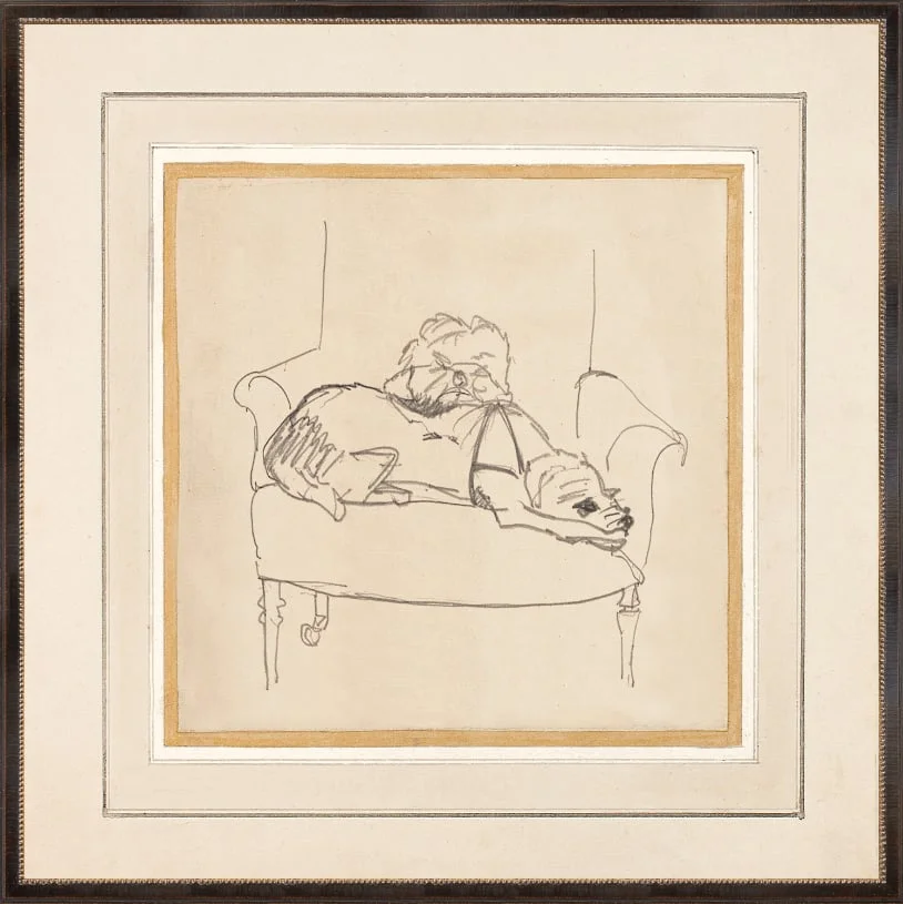 moreA loose pencil drawing of two charming little dogs snuggled together on a chair. Framed in a thin dark wood moulding with a beaded detail.