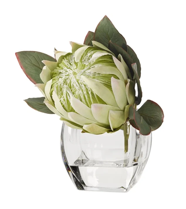 The Accessories White Green Protea in Glass Cube, made by D&W Silks,