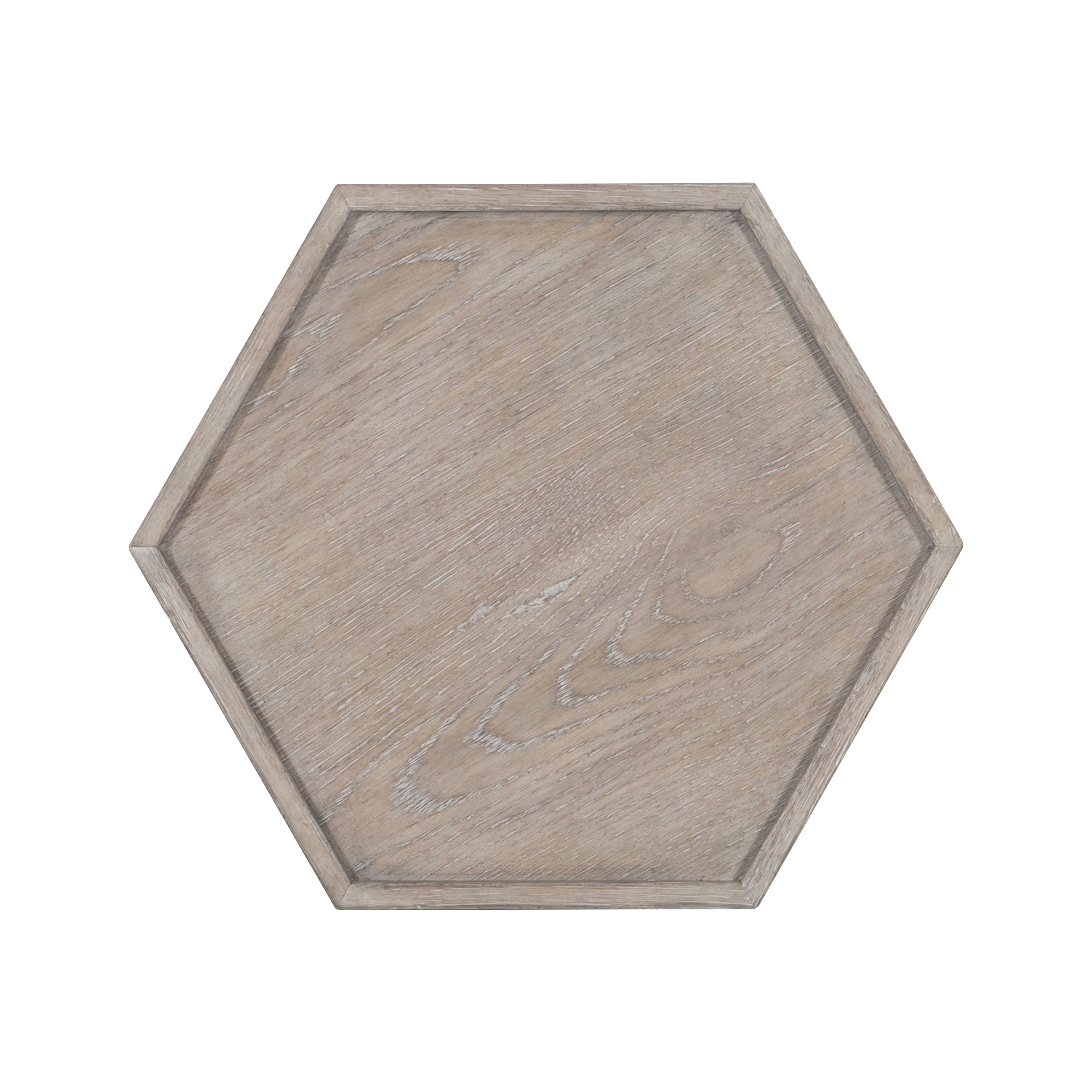 Six legs, Pewter finish on the table, Features hexagonal shape with gallery top and decorative apron, Adjustable glides, White oak solids and knotty white oak veneers, Specifications subject to change without notice