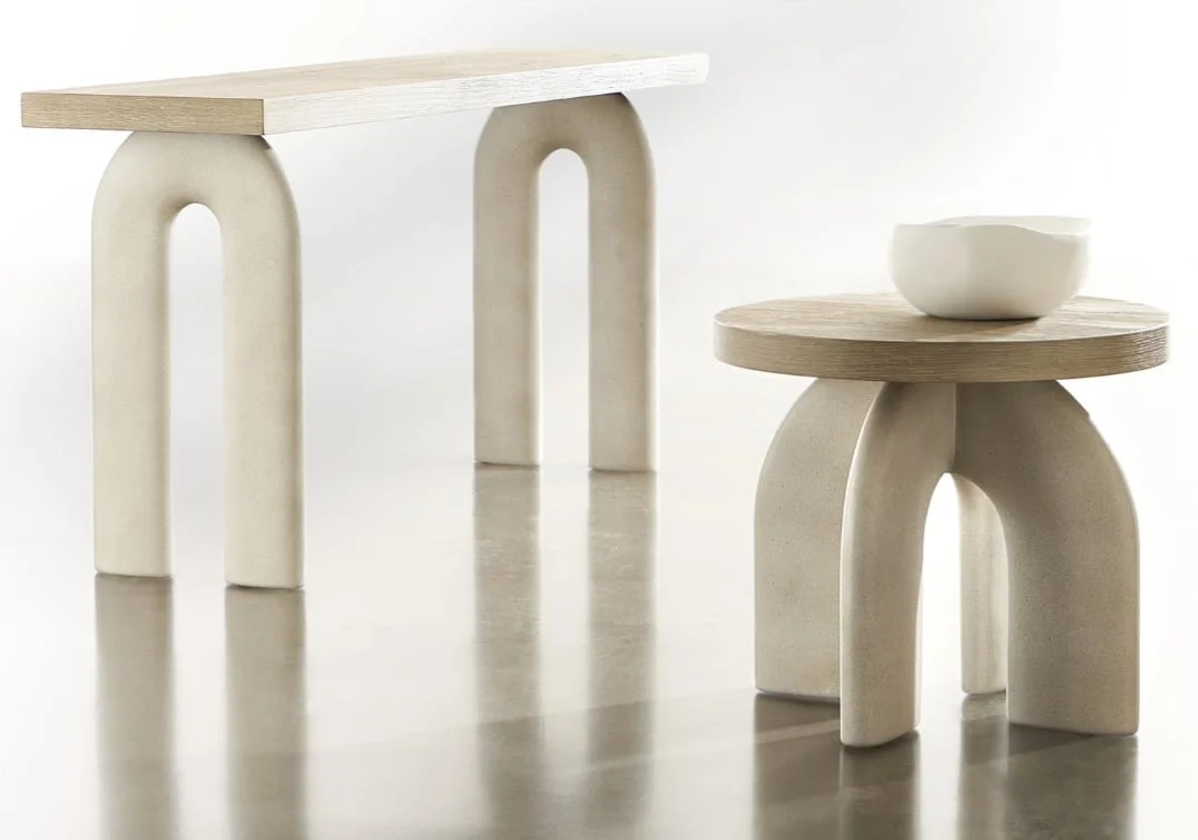 moreAn interlocking sculptural base makes an artistic statement on the Antibes side table. Bisecting arches are crafted from a textural glass-reinforced concrete in a Pumice finish. The base contrasts beautifully with a round wood top in the rustic Roz finish.