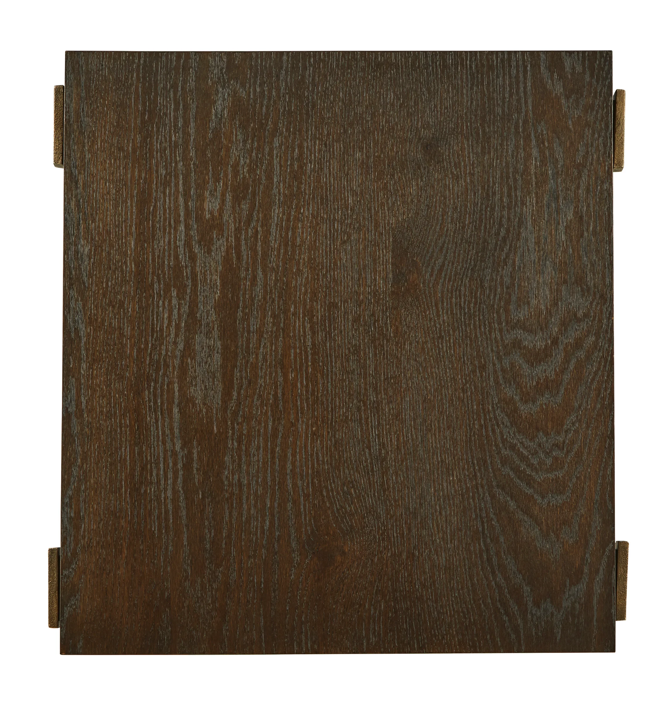 - Made of oak veneer and engineered wood. Light wire-brushed effect. Distressed sand-casted aluminum base with antiqued goldtone finish