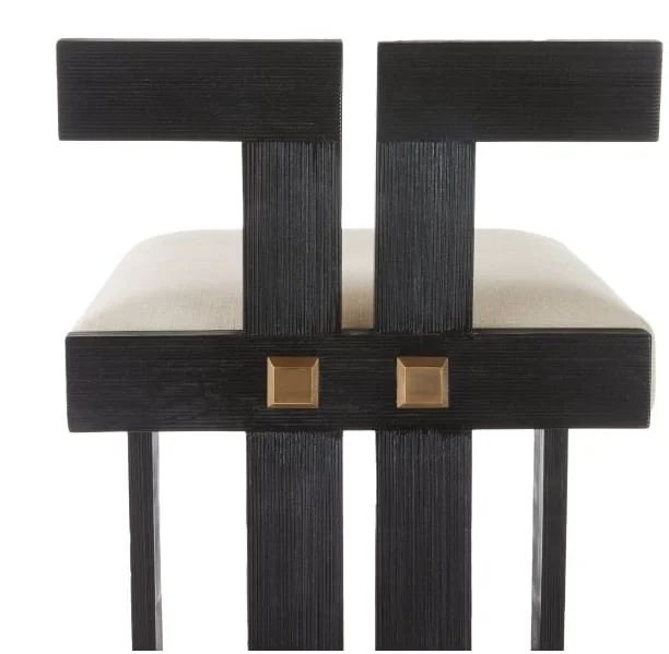 moreA MODERN MIX OF ’70S AMERICAN DESIGN WITH ZEN ARCHITECTURE, THIS ELEGANT STOOL HAS AN EASTERN APPEAL. CRAFTED OF RIBBED BEECH WOOD STAINED IN EBONY, THE SPLIT BACK IS ACCENTED WITH ANTIQUE BRASS STUDS AT VERY CENTER. A PADDED SEAT OF NATURAL LINEN ADDS STYLE AND COMFORT.