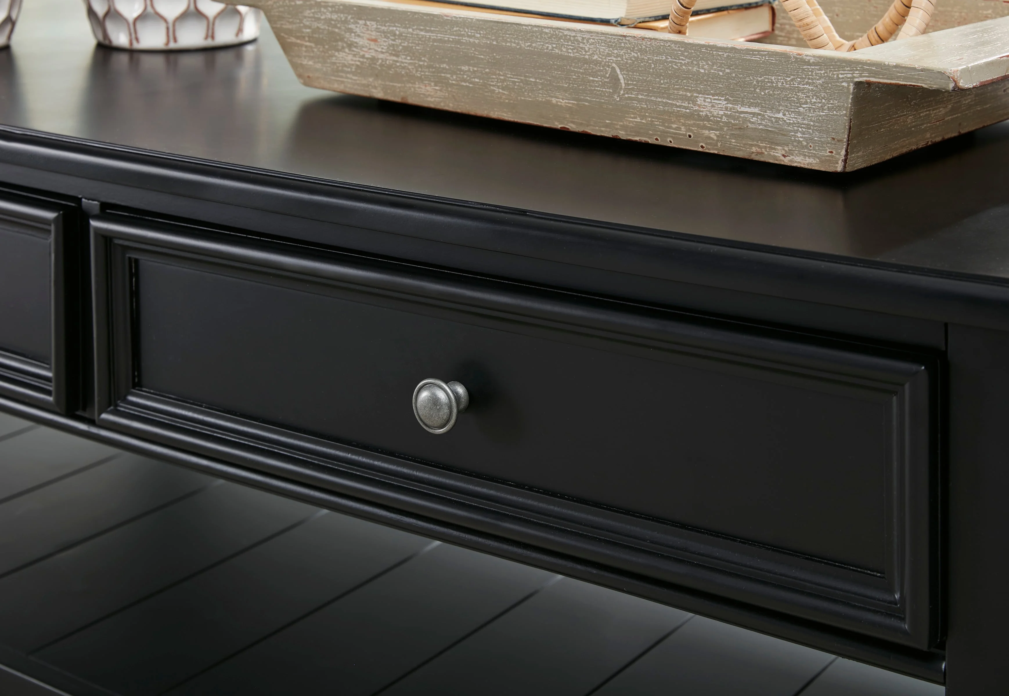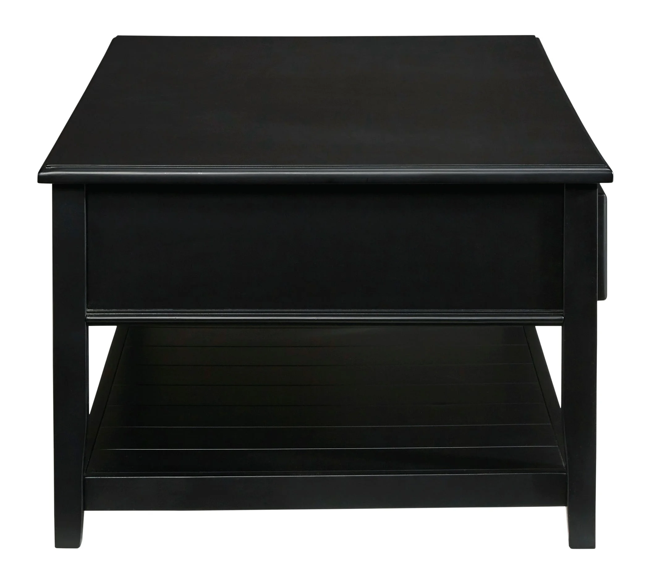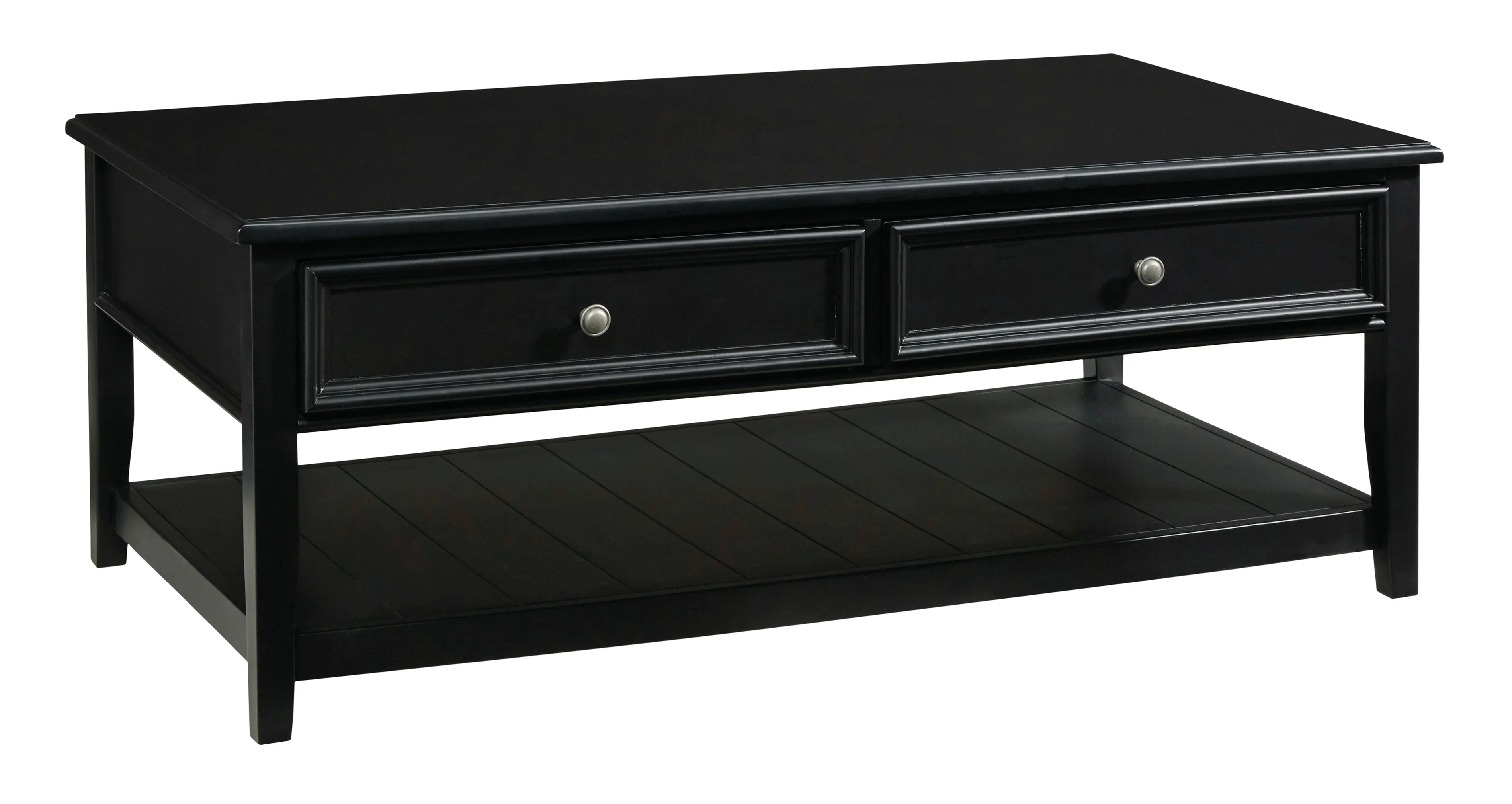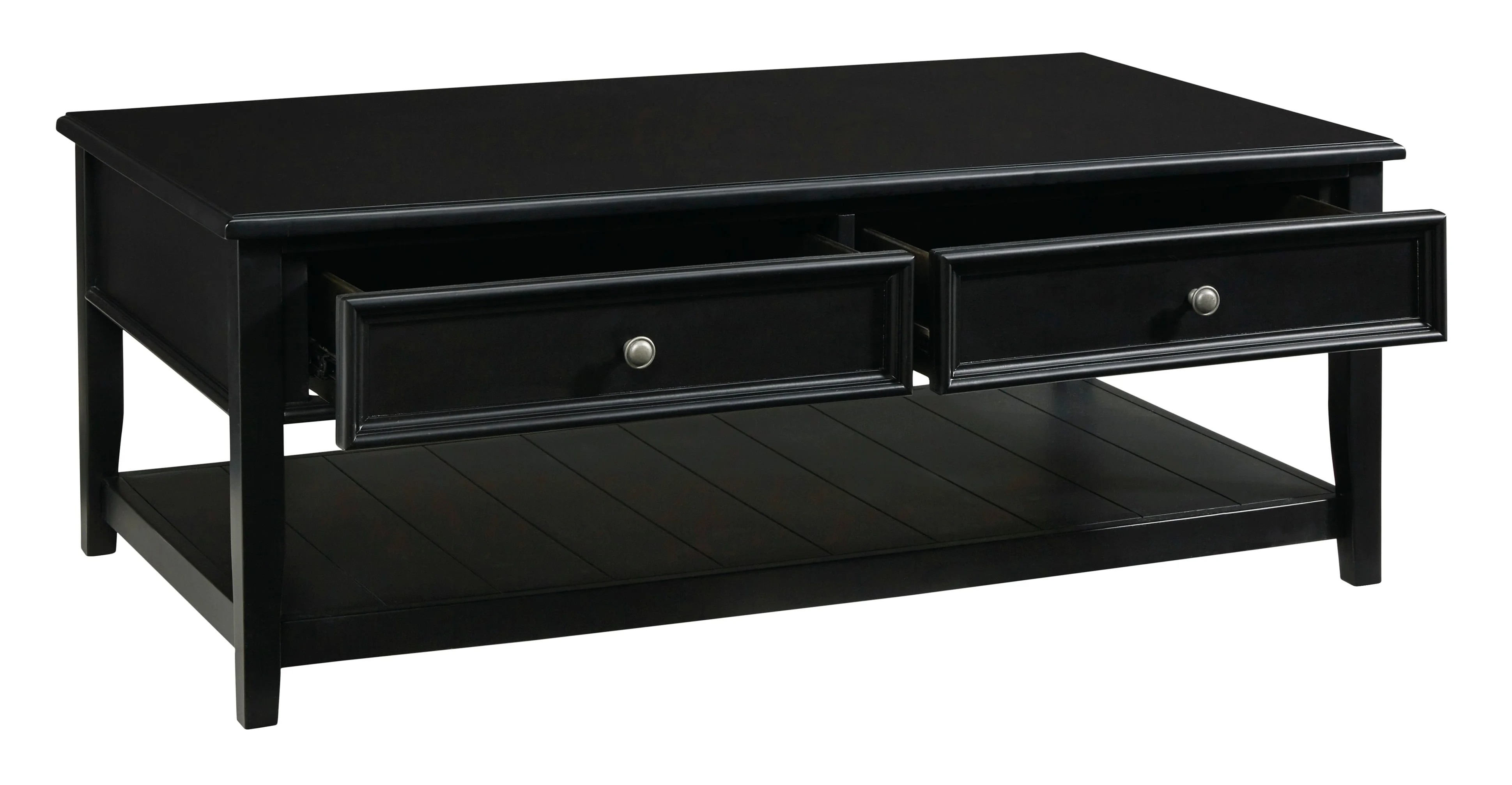The Beckincreek Black Coffee Table with 2 Drawers and 1 Shelf, made by Signature Design by Ashley,