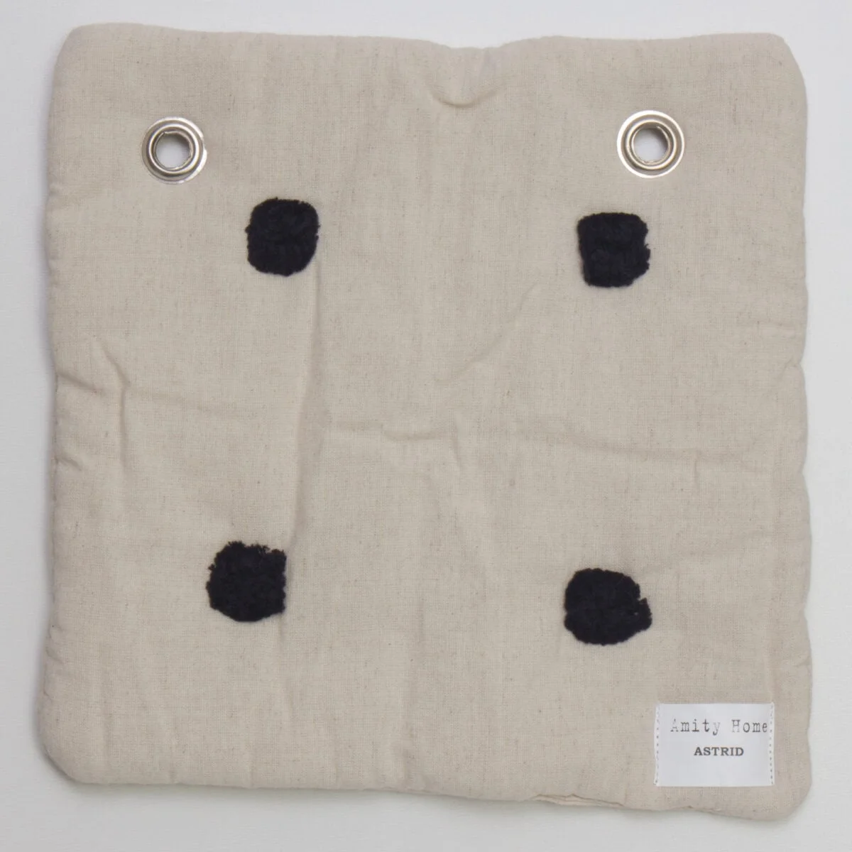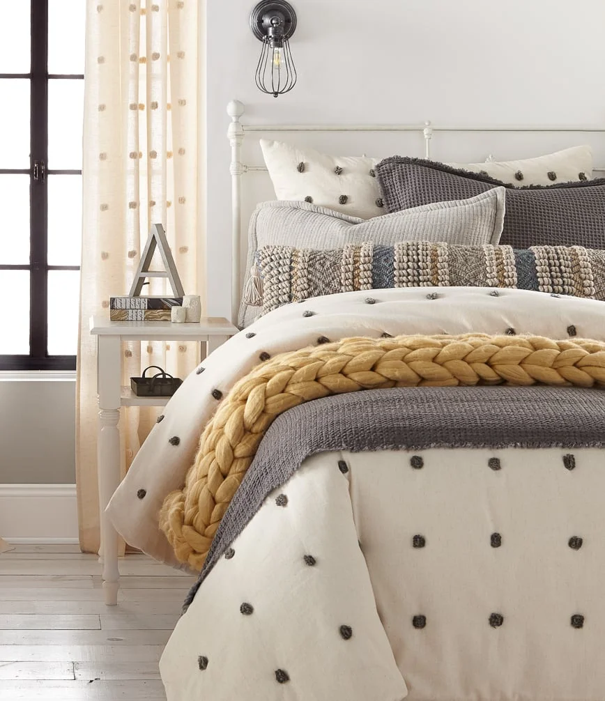 Here the Astrid Quilt and Dutch Euro act as the foundation, with its raw cotton and flax ground gridded with graphic cotton tufts in Asphalt. The white and natural linen ticking stripes of the Tipton quilt is a perfect contrast in color and brings a classic element to the ensemble. The chunky Ava throw and hand-loomed Maryam XL Bolster add a pop of color and texture. Maryam is part of the Weaving a Better Life program, constructed from up-cycled materials and supports individuals struggling with low-income and homelessness.