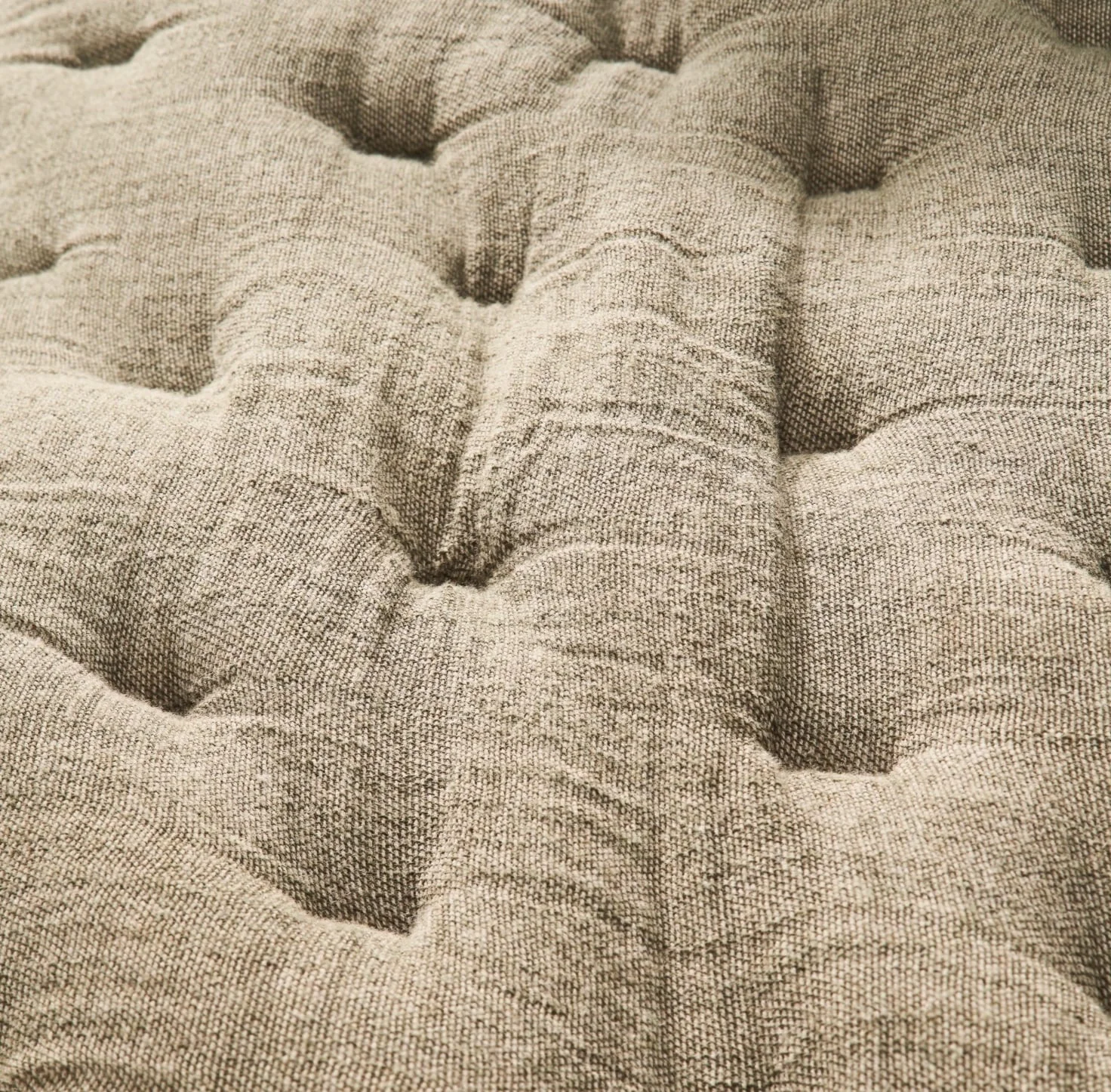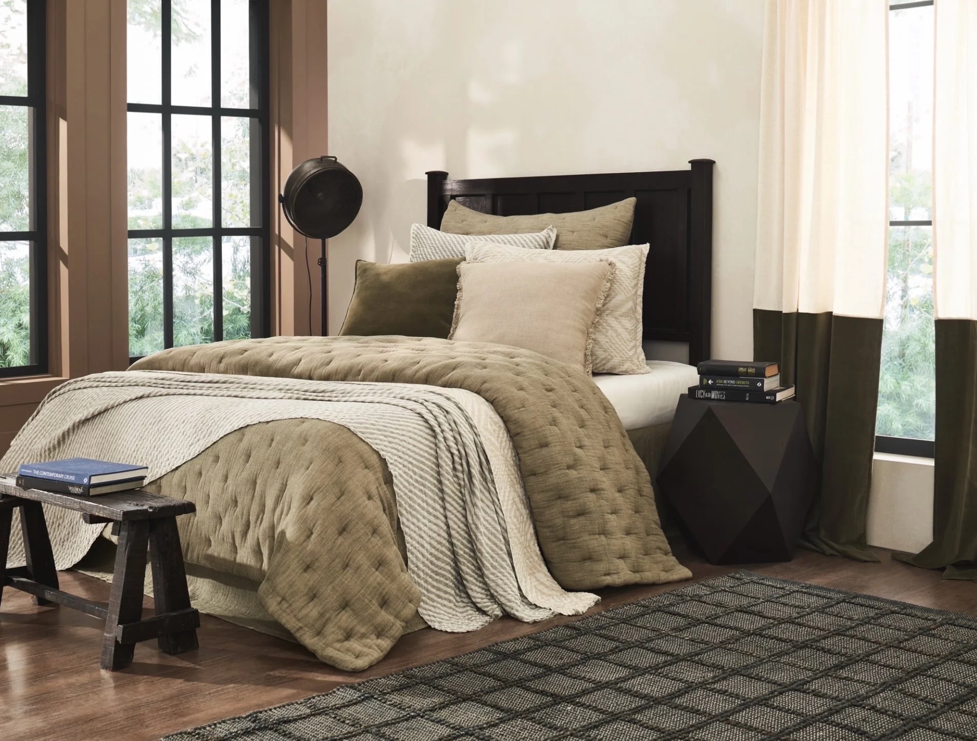 moreThis ensemble exudes casual simplicity without compromising on style. The Gibbons coverlet is a soft cotton double cloth that reverses from one geometric pattern in natural and ivory to another unique pattern in a grey green tone that blends with so many popular green hues. Here the Gibbons is tossed casually across the foot of the bed to add texture and interest, or it can be used as the first layer on either side as a light weight sleeping layer. The Dalton quilt with its lofty fill adds a cuddly soft component. Adding solid accents of cotton velvet (Sloan) and a slubby linen (Preston) add depth in tone and texture.