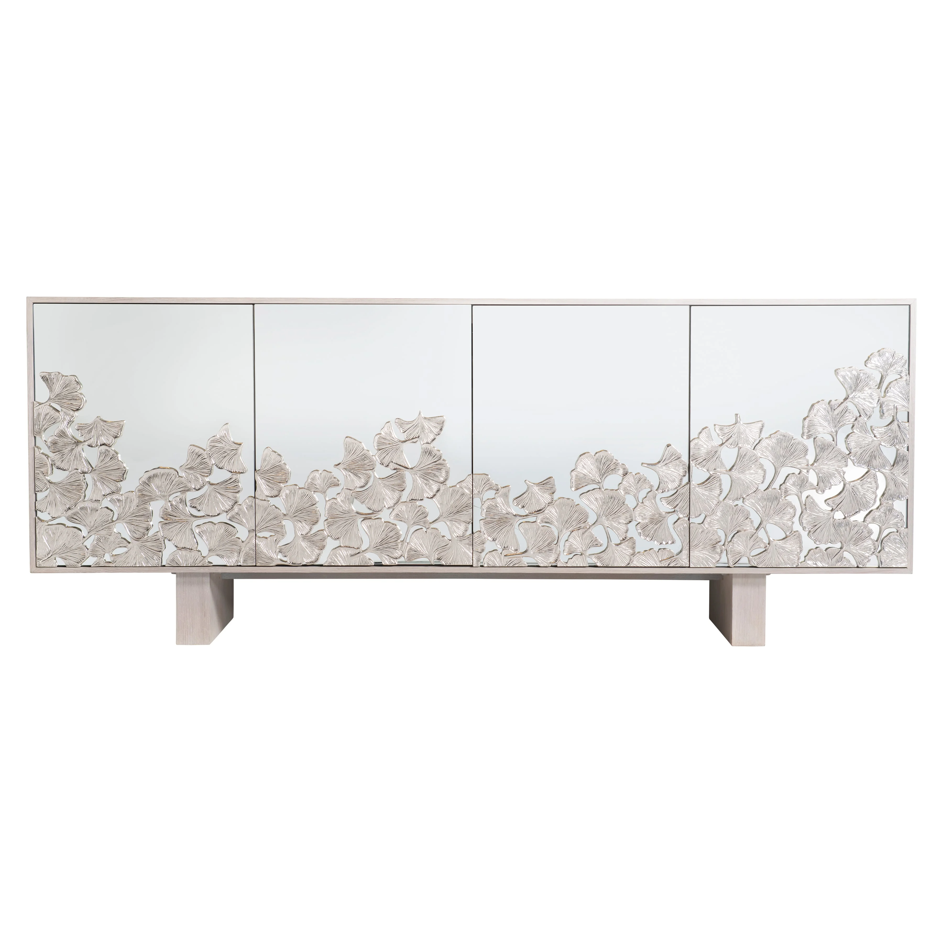 moreA romantic swirl of gingko leaves plays across the four mirrored doors on the Nara Entertainment Credenza. The beautiful leaves are created of cast aluminum in a shiny nickel finish, complementing the grayed finish on the case. But this beauty is also armed for function, providing plenty of storage for media components behind the doors, including adjustable doors, drawers, vents, and grommet holes.