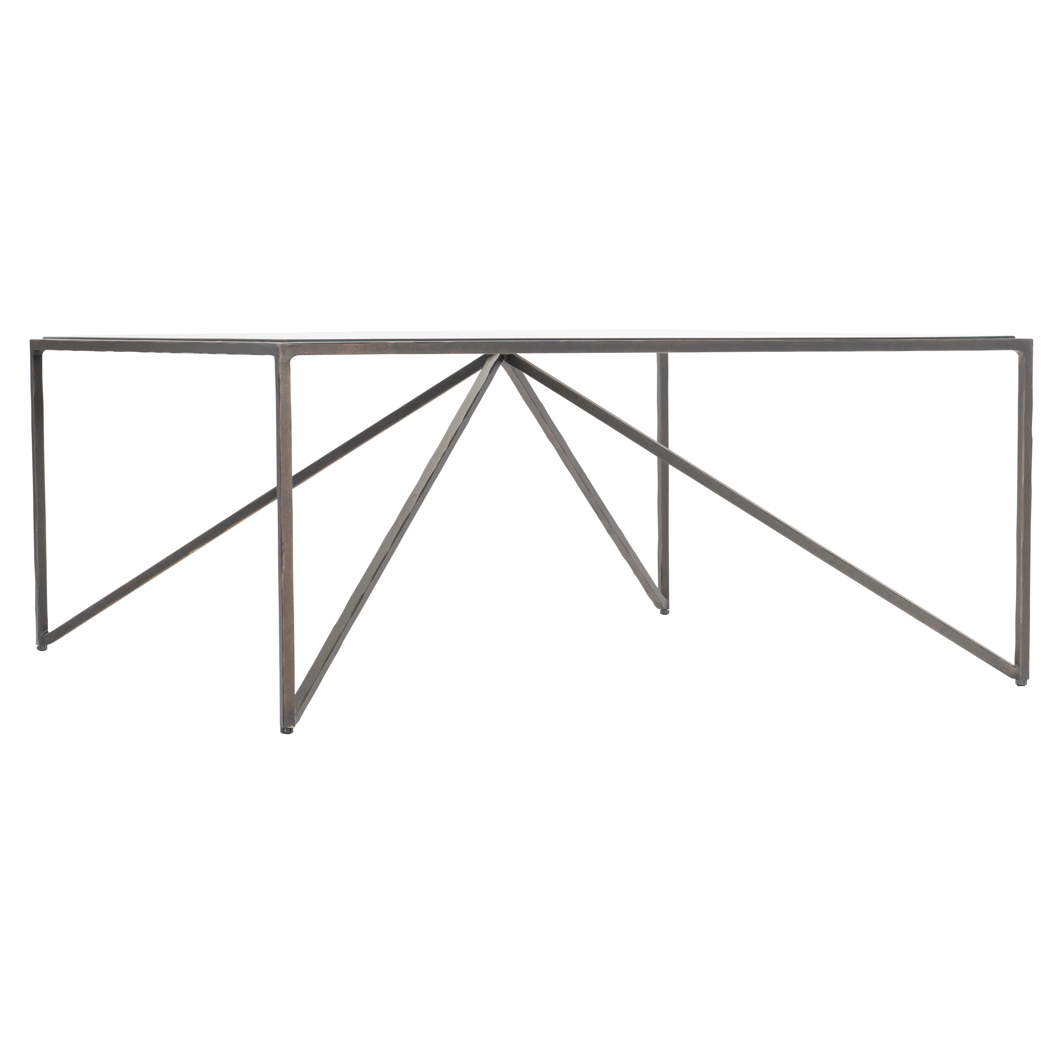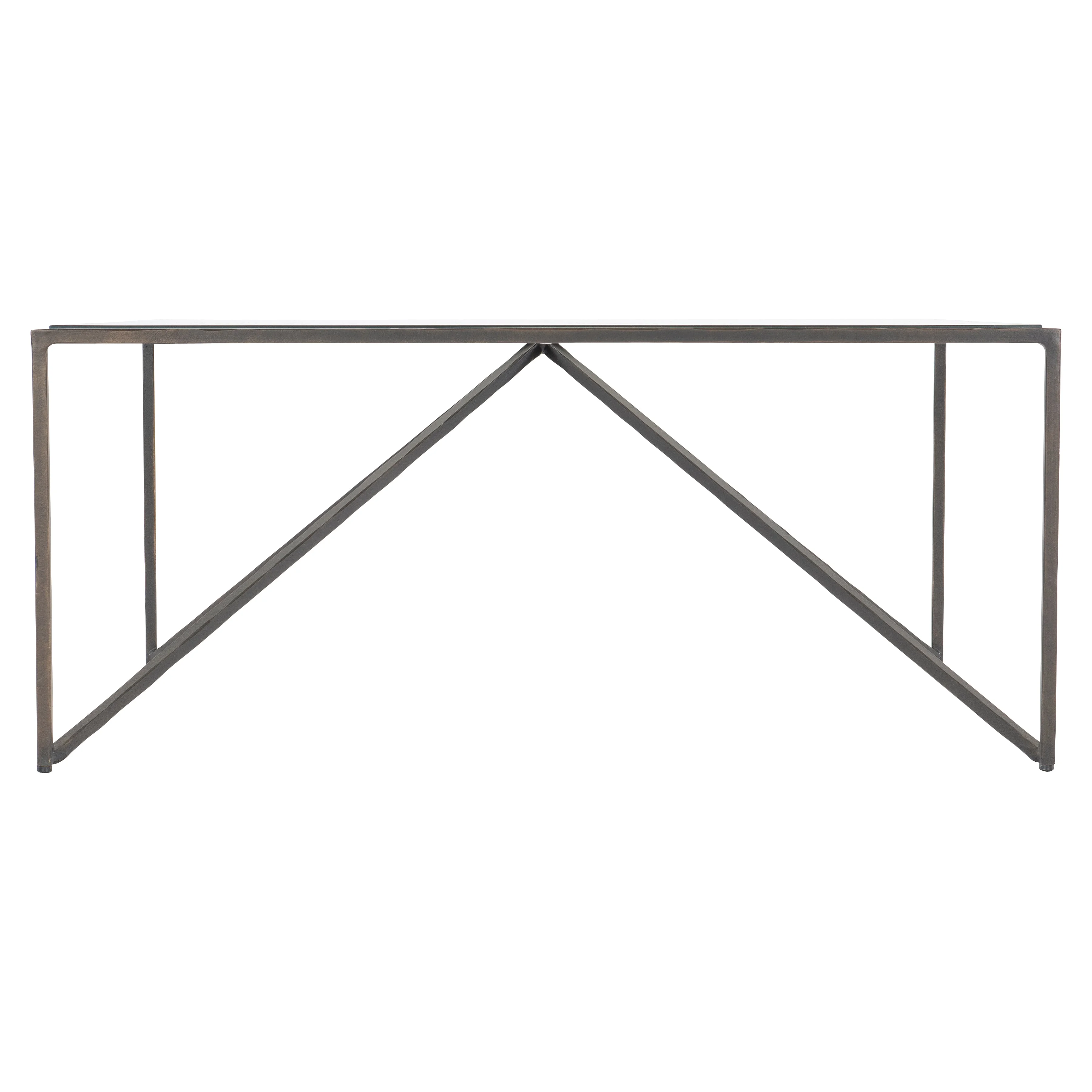 Specifications subject to change without notice, Iron base and stretchers with lightly hammered texture and New Aged Bronze finish, Small adjustable glides, Inset tempered glass table top