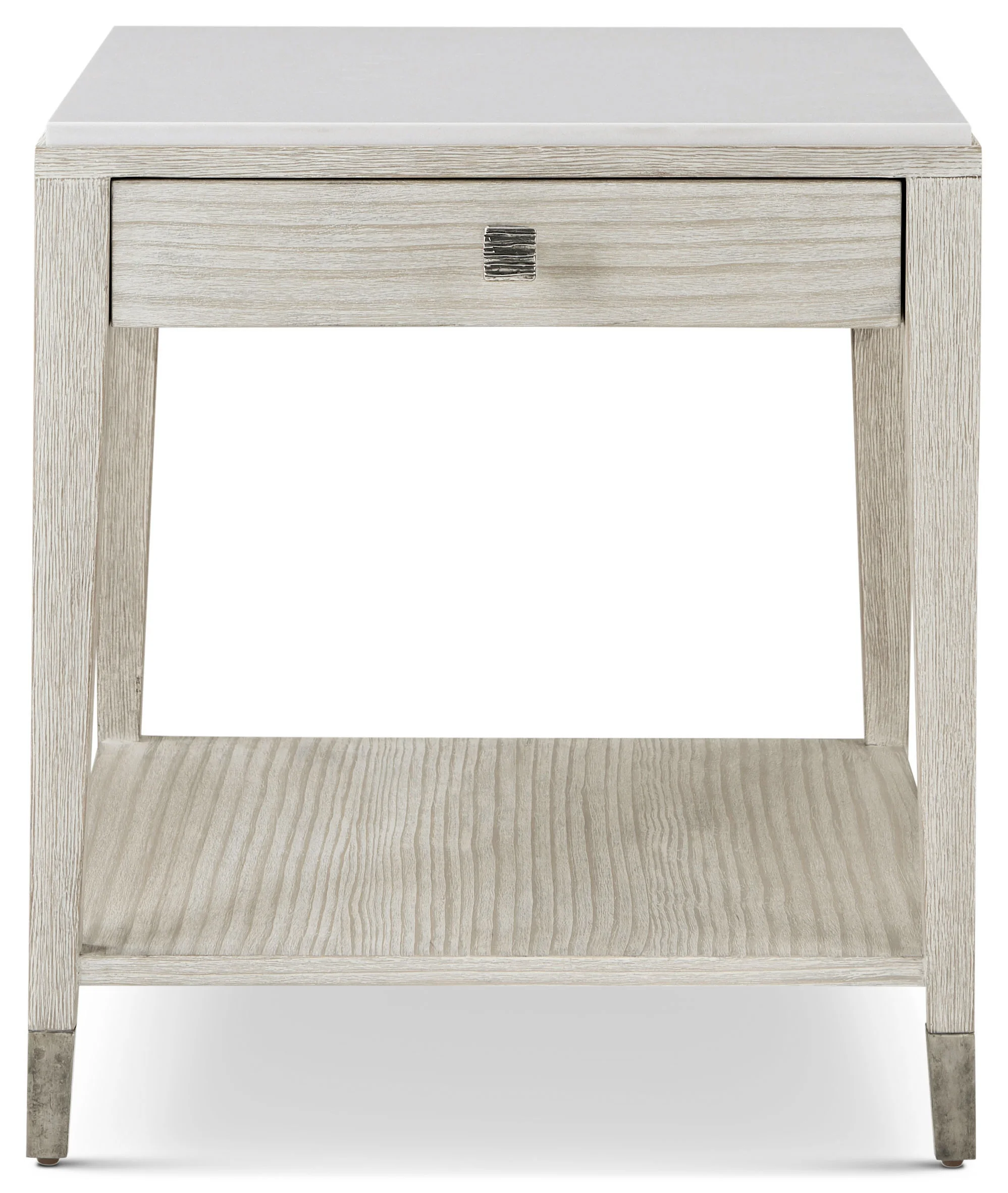 moreSeen here with a chalky white limestone top and base crafted from wire-brushed cerused pine in our new Sea Salt finish. This side table contains drawer, a lower storage shelf, and an organic ribbed metal knob seen in our Dark Sterling finish. Standing effortlessly on tapered block legs.