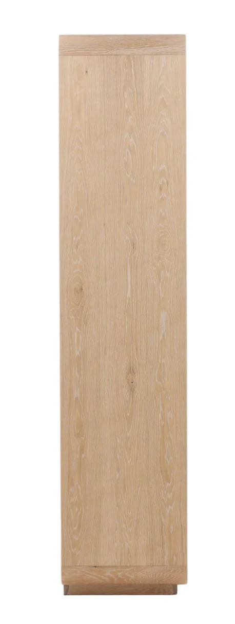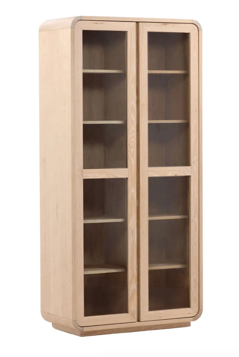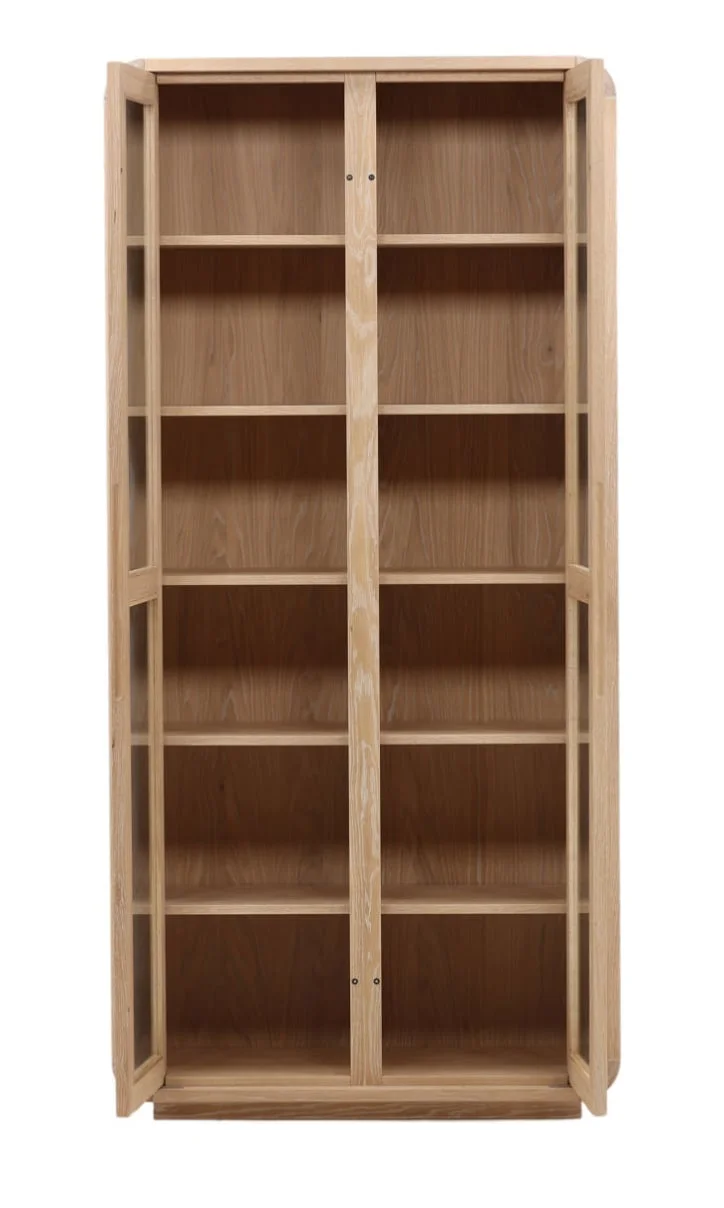moreCrafted from oak wood and rustic oak veneer frame in a natural wash, featuring tempered glass door panels and five-tier shelving inside.