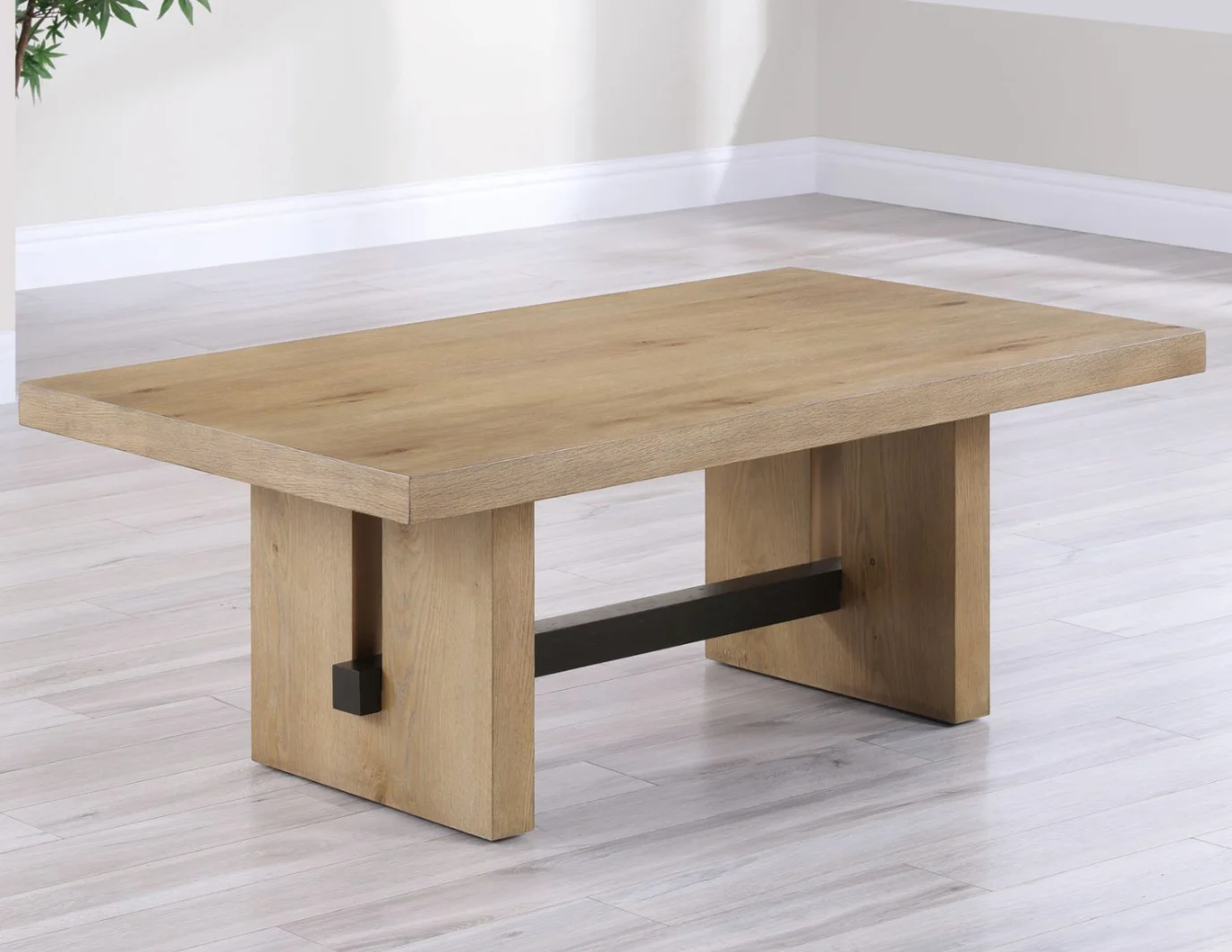 moreThe 48-inch Aubrey driftwood coffee table perfectly balances farmhouse style with timeless elegance. Made from rich acacia veneers and hardwood solids, it showcases refined craftsmanship with rustic charm. The weathered driftwood finish contrasts beautifully with black accents, while exposed tenons add a touch of rustic flair. Its sturdy squared trestle base ensures excellent stability, supporting the thick tabletop farmhouse top for durability. With a spacious 48″ surface, it’s ideal for casual gatherings or displaying décor, making it a versatile centerpiece for any living room. This coffee table combines style and function, offering a stunning anchor for your space.