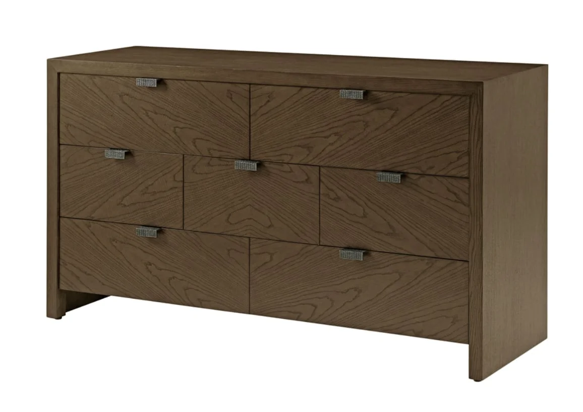 moreSleek seven drawer bedroom dresser made of figured cathedral ash available in Dune or Earth with textured metal pulls in our Ember finish and soft close drawers.