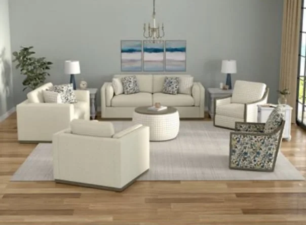 moreCecily draws quiet attention with its balanced blend of structural and tailored shapes. Starting with a solid wood floating base, soft, cream-colored fabric covers the uncluttered lines and clean silhouette of the sofa, loveseat, and chair. Swivel chairs in floral and windowpane patterns are trimmed on all edges with shapely wood for stylish accessories. Completing the ensemble is a coordinating ottoman with hidden storage and castors to glide with ease. The Cecily collection will be the belle of your room with its transitional appeal.