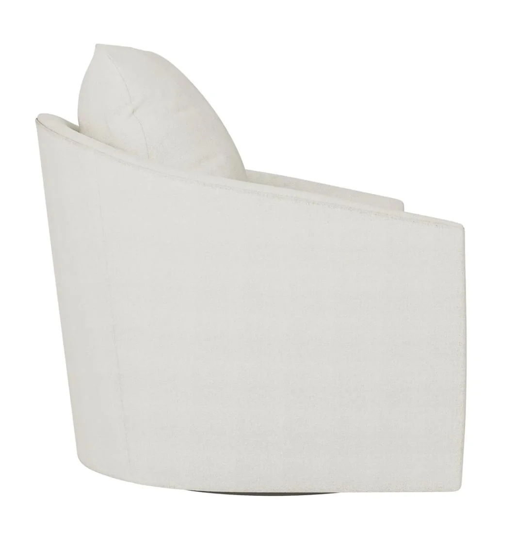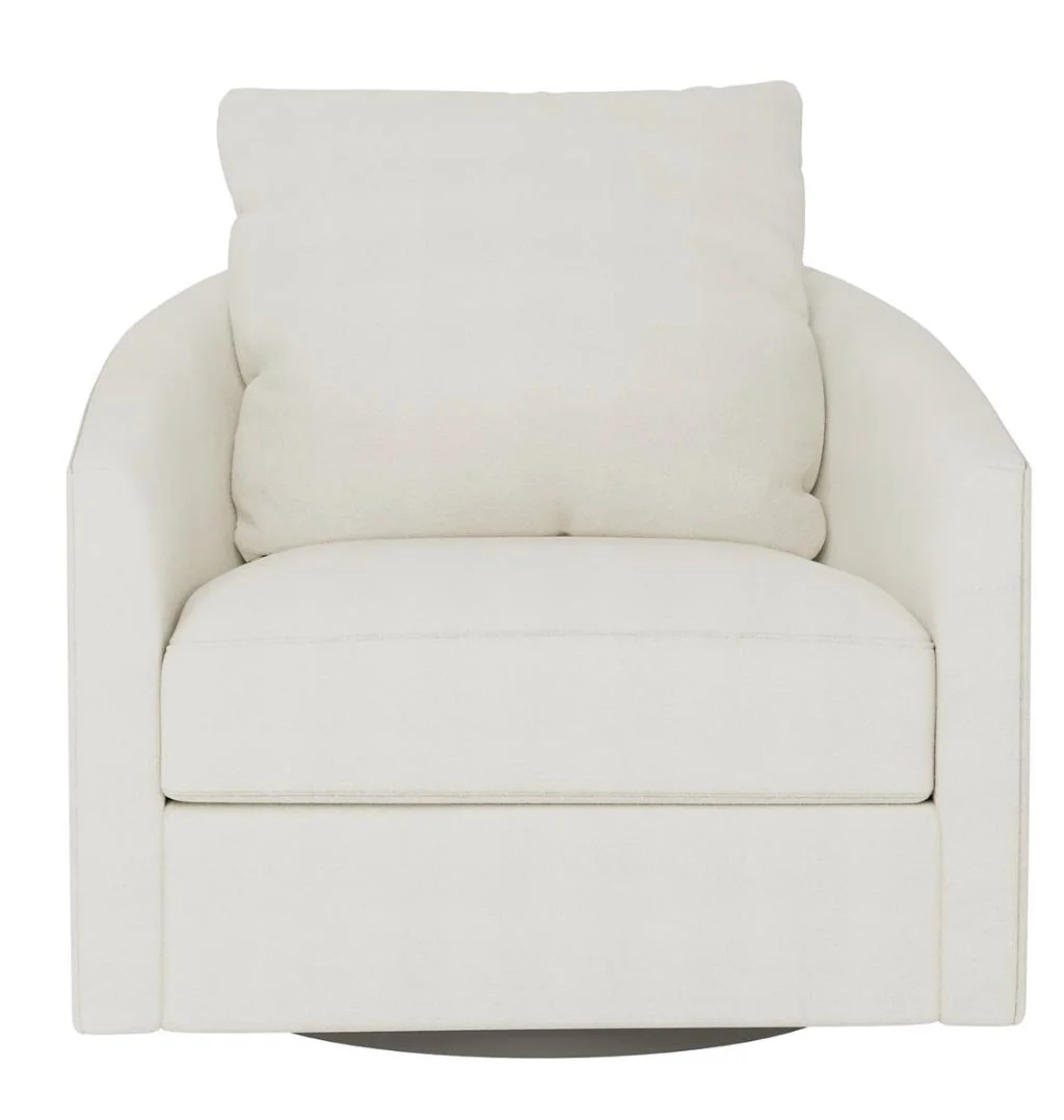 moreSoft curves, sloped arms and plush cushions give this subtly sophisticated swivel chair its relaxed modern look.