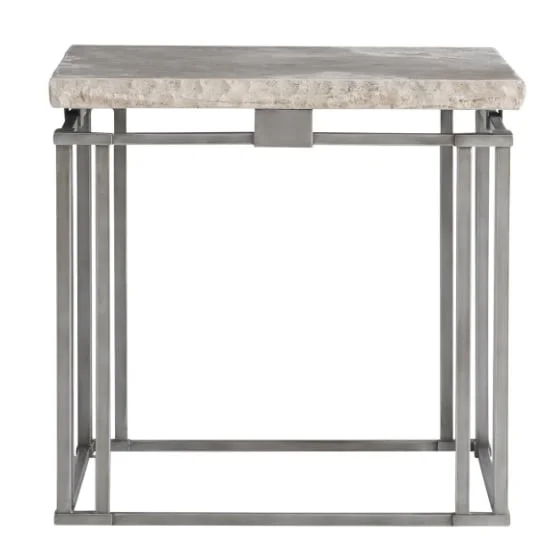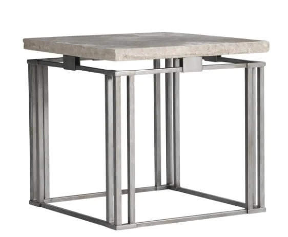 The Riverton side table's design finds its inspiration in the Arts and Crafts period, with simple lines that celebrate form and style. Metal bars interlock for the base, allowing a honed Bianco Travertine laminated stone top to float above the frame.
