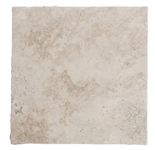 Honed Bianco Travertine-laminated stone top with chiseled edges