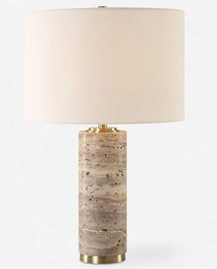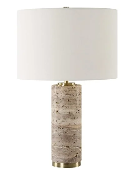 moreFeaturing an unfilled honed travertine base paired with sophisticated plated antique brass accents. This piece combines natural beauty with a touch of luxury, making it a perfect addition to any decor seeking a balance of earthiness and refinement. A round hardback drum shade made with a crisp white linen fabric completes the piece.