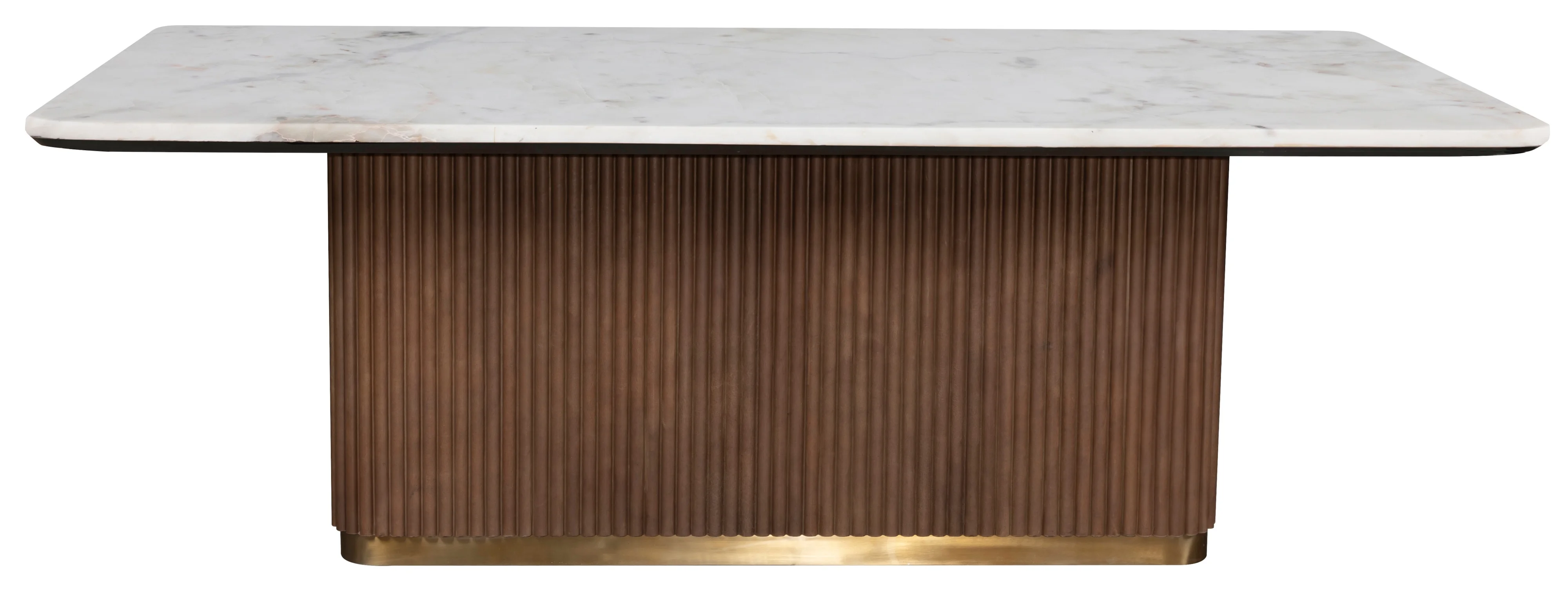 The real showstopper is the beautiful marble top, which adds a touch of elegance and refinement to the table. The combination of the dark wood and marble creates a striking contrast that is sure to impress. Plus, the leather wrap detailing adds a luxurious feel to the overall design.